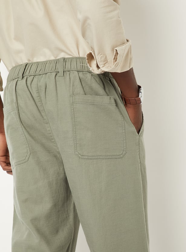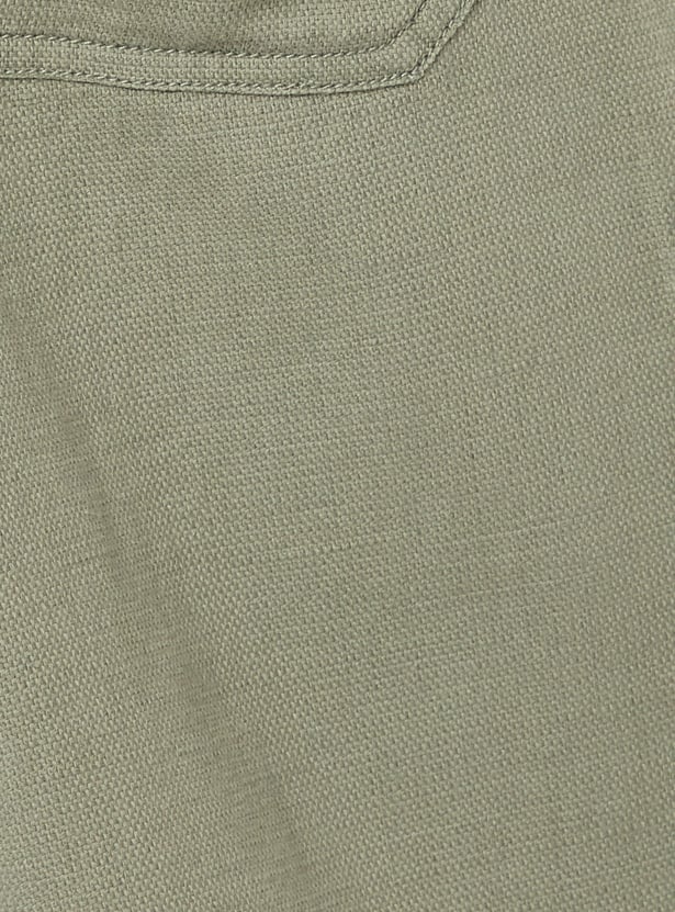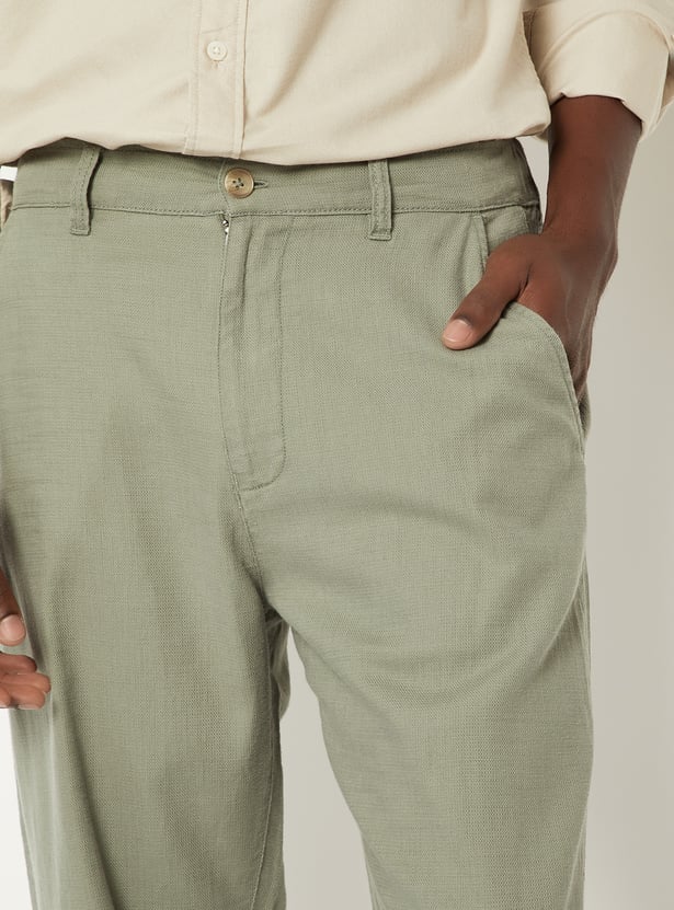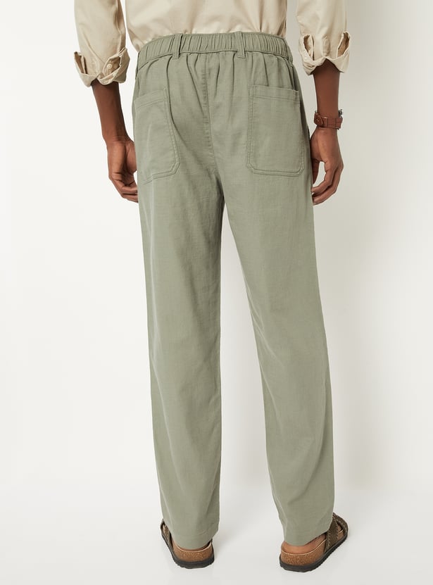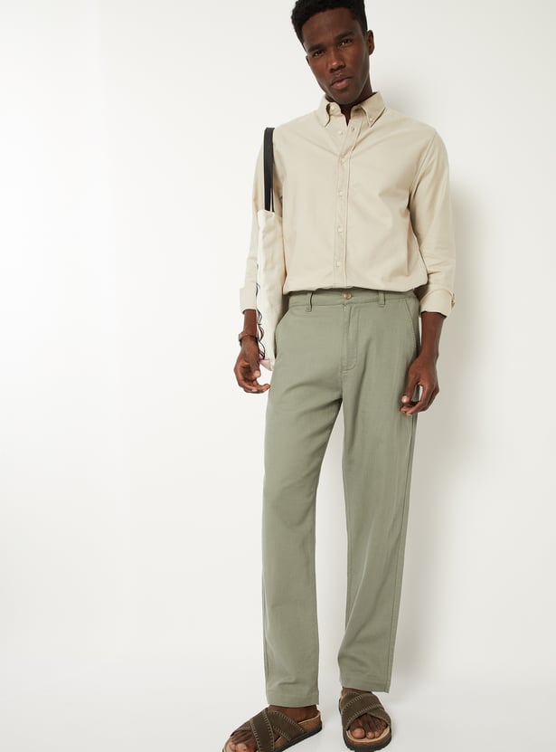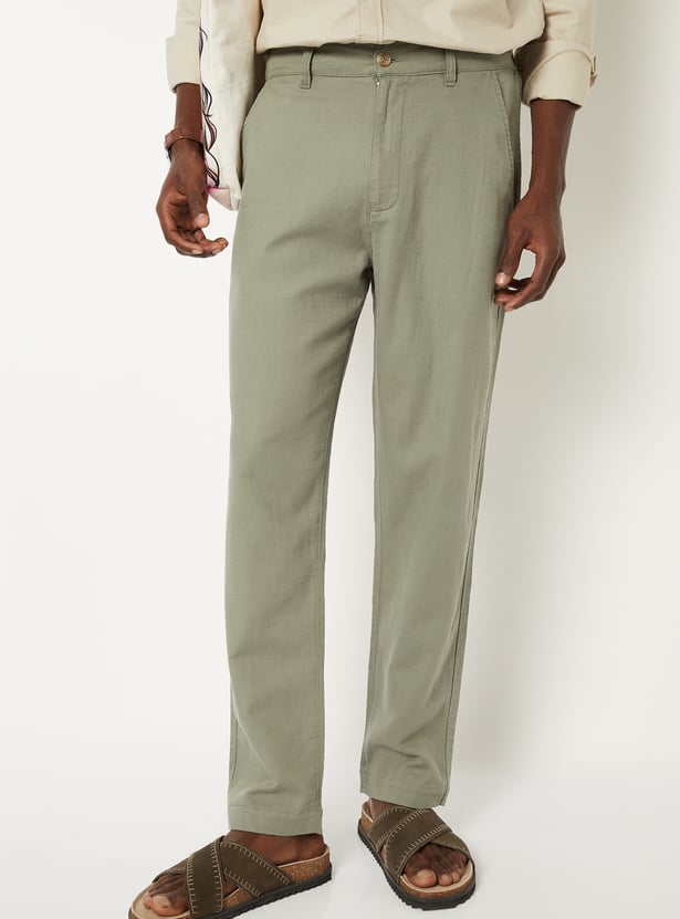 Classic and versatile, these solid regular fit trousers feature a button and zip closure, functional pockets, and belt loops for a tailored look. The partially elasticated waist ensures added comfort without compromising on style, making them perfect for both work and casual wear.