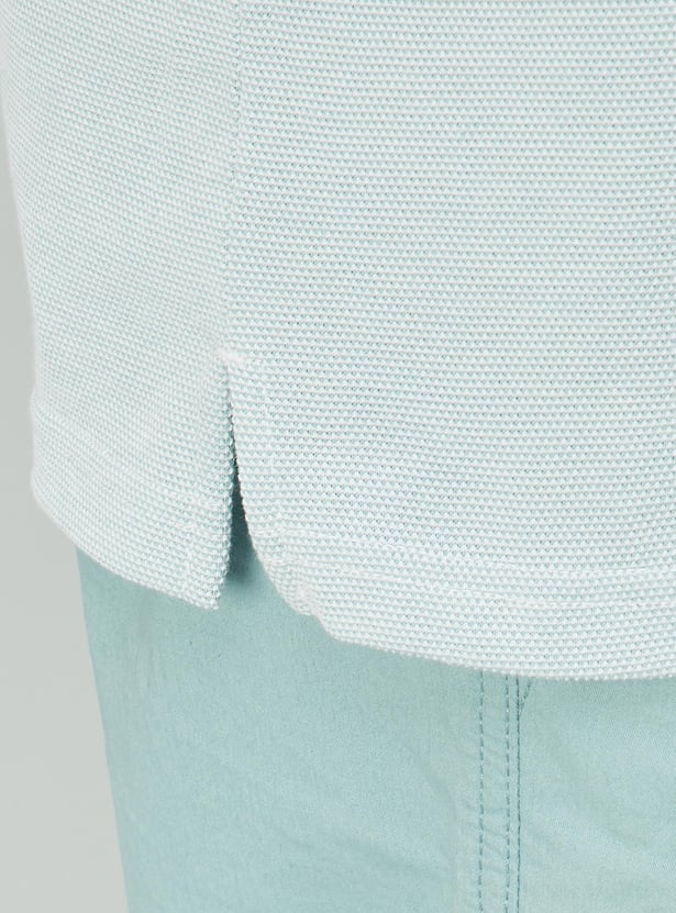 Upgrade your casual wardrobe with this polo T-shirt that features a classic polo collar, half sleeves, and vented hem to lend you comfort all day long. The solid surface adds a stylish flair to your overall look.