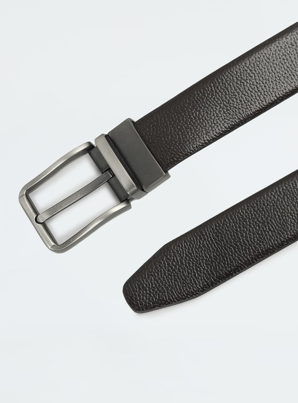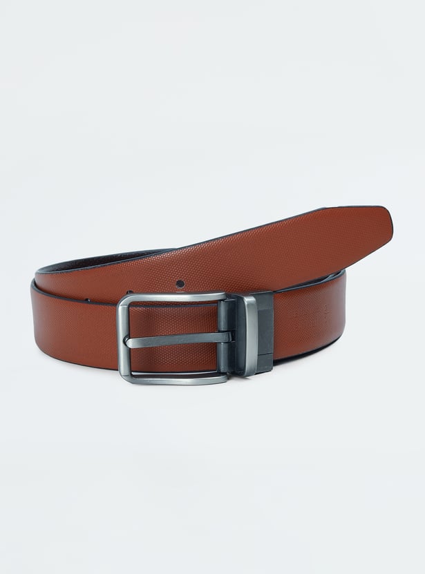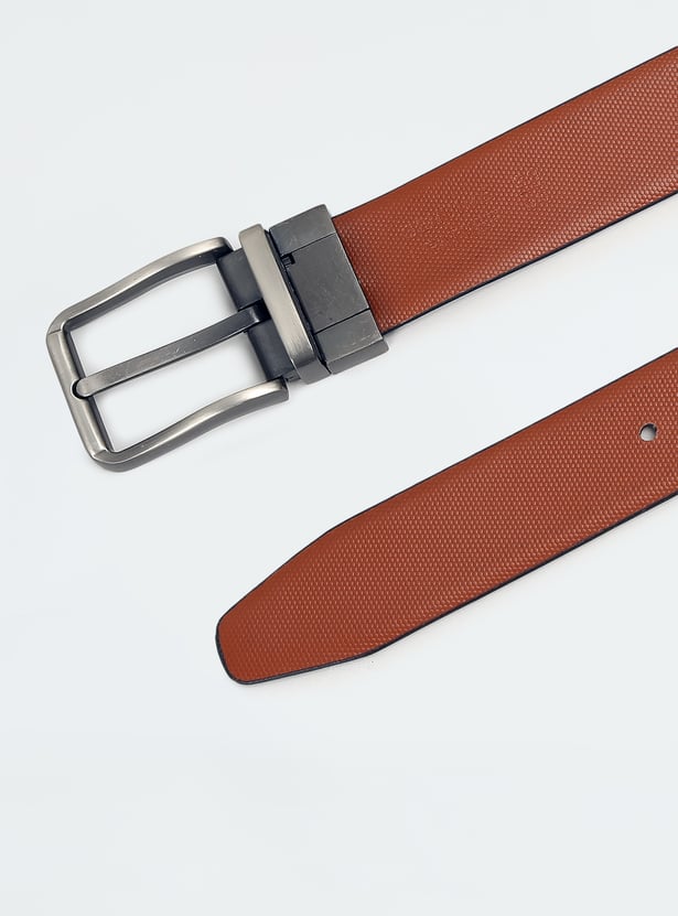 Elevate your appearance with this textured reversible formal belt, complete with a tang buckle closure. This accessory is perfect for achieving a debonair and polished look.
