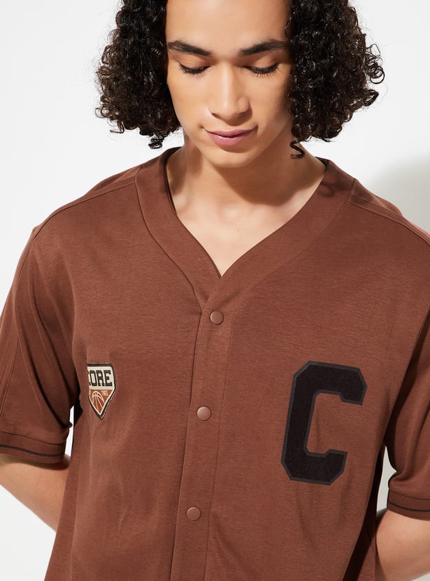 Level up your style with this Varsity T-shirt. Featuring a button placket, V-neckline, half sleeves, and a ribbed hem, it's designed for both comfort and fashion. Perfect for adding a sporty yet stylish touch to your everyday look.