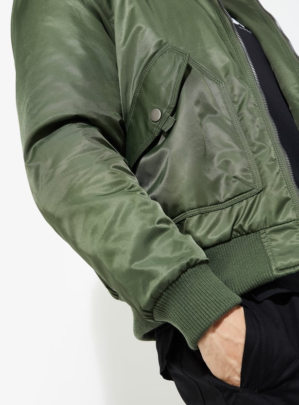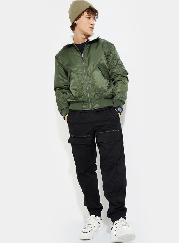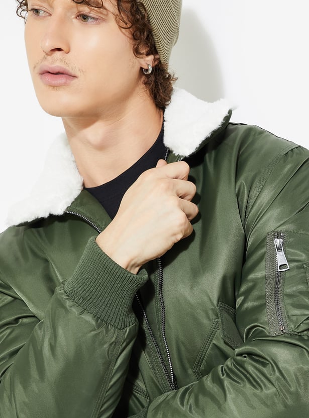 Stay warm and stylish with this bomber jacket. Multiple pockets ensure practicality. It is designed with a sleek, classic bomber fit. The sherpa collar and ribbed trim add a cosy touch.