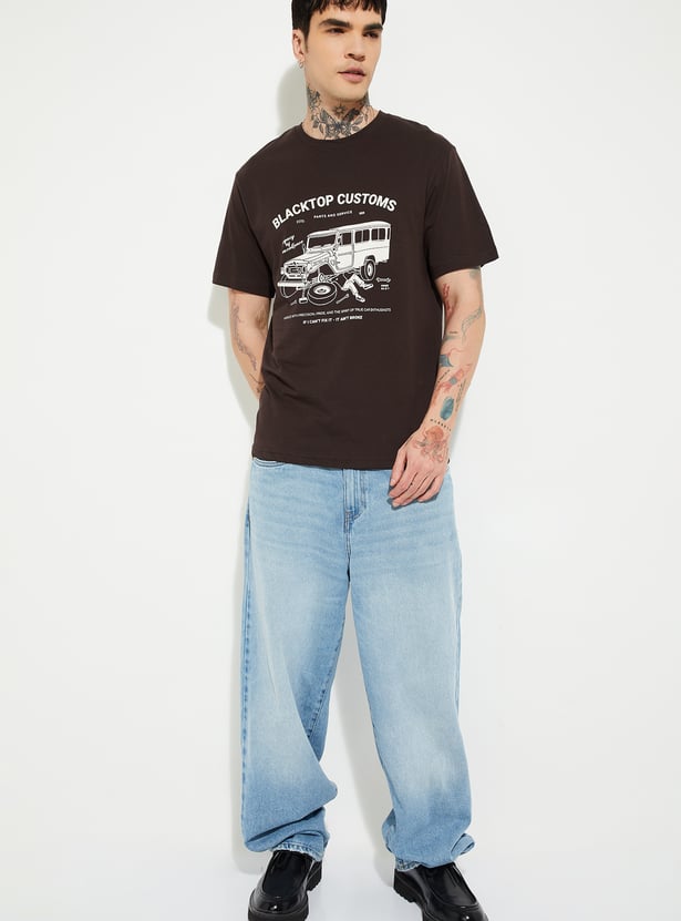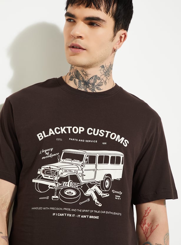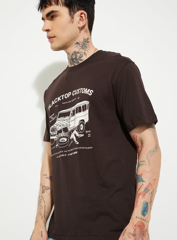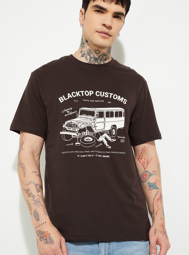 Add a touch of style to your casual wardrobe with this printed T-shirt. Featuring a classic crew neck and half sleeves, it offers everyday comfort with a trendy edge, perfect for layering or wearing solo.