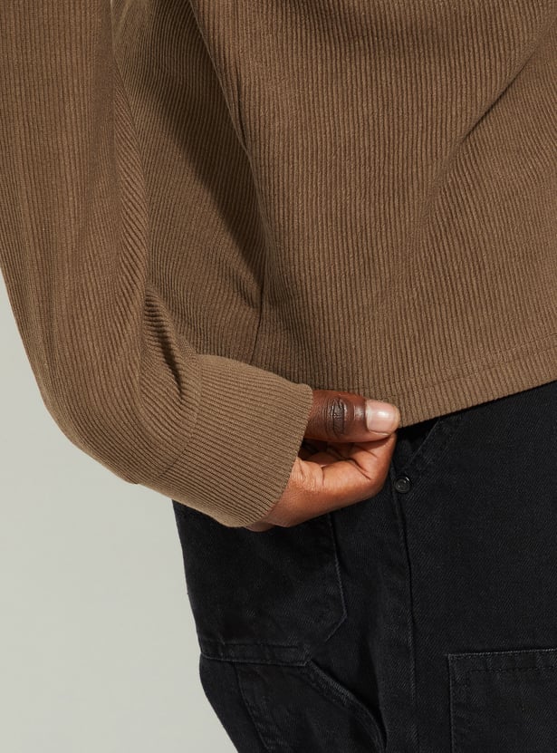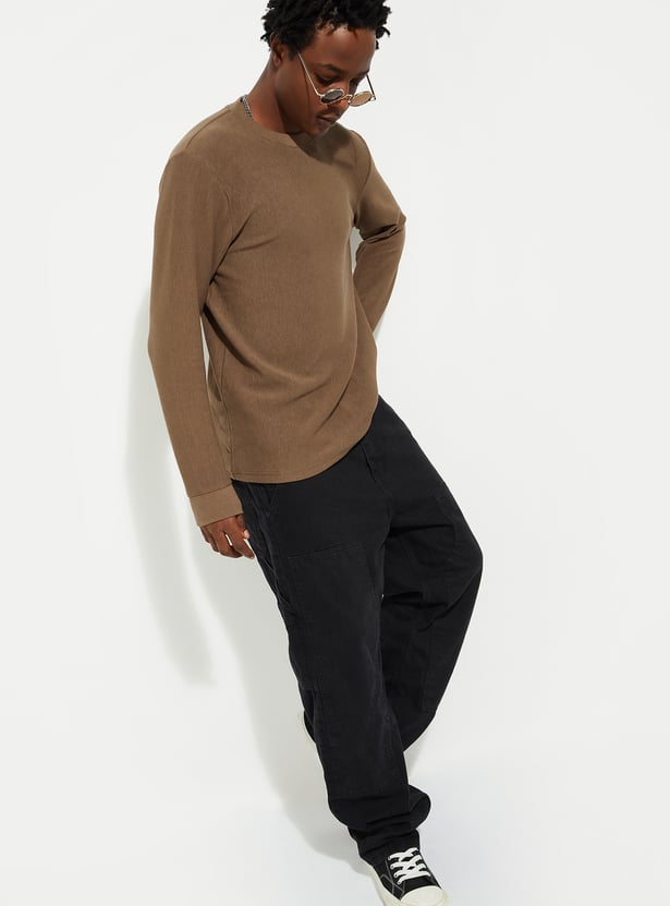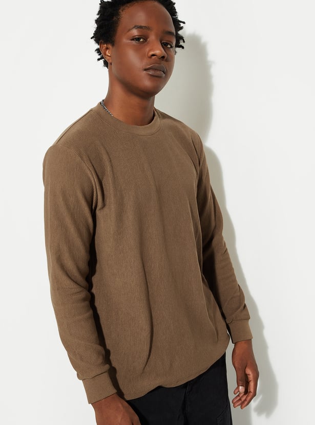 Level up your street style with this ribbed T-shirt, designed to turn heads. Featuring full sleeves and a classic crew neck, it guarantees all-day comfort. The regular fit enhances its effortlessly cool vibe, making it the perfect go-to for a laid-back yet stylish look.
