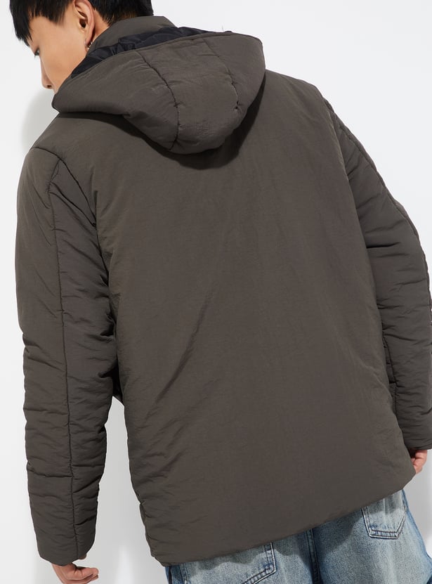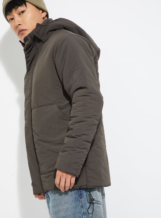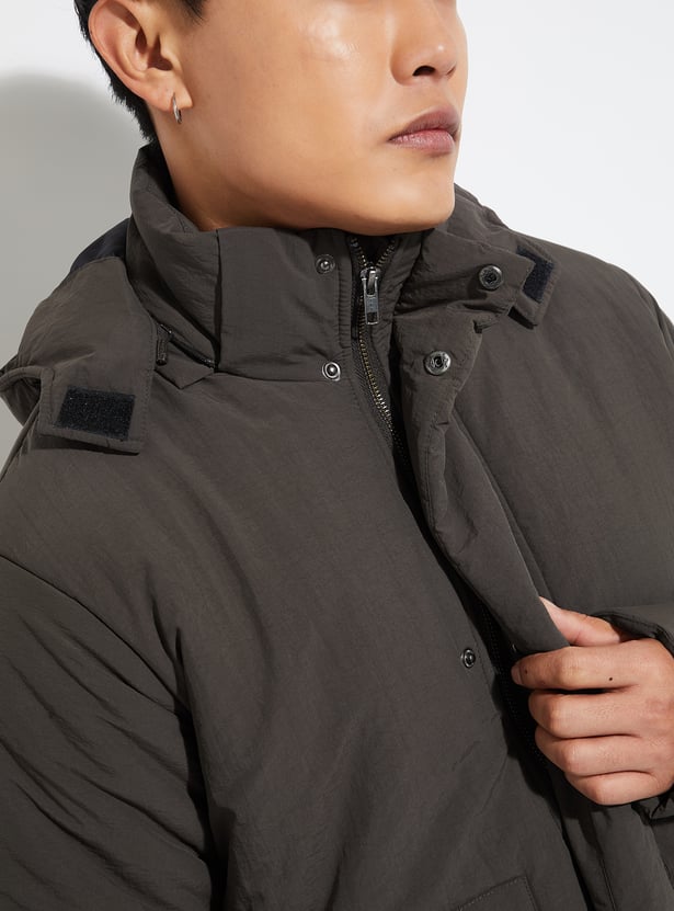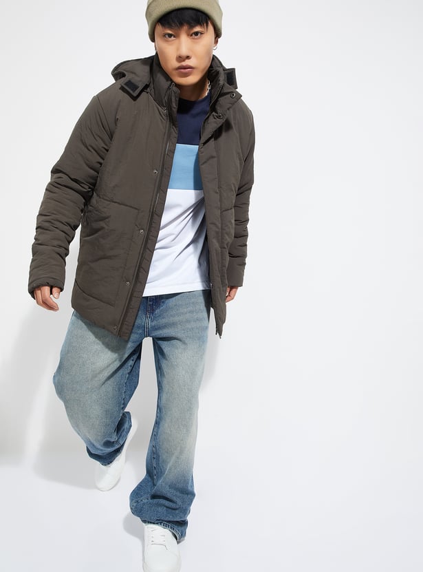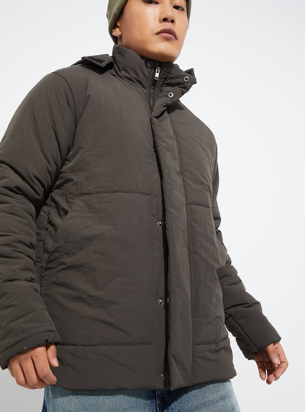Stay cozy and stylish in this solid padded jacket. Featuring a hooded neck, button closure, full sleeves, and practical pockets, it’s the perfect outerwear to keep you warm while maintaining a sleek look.