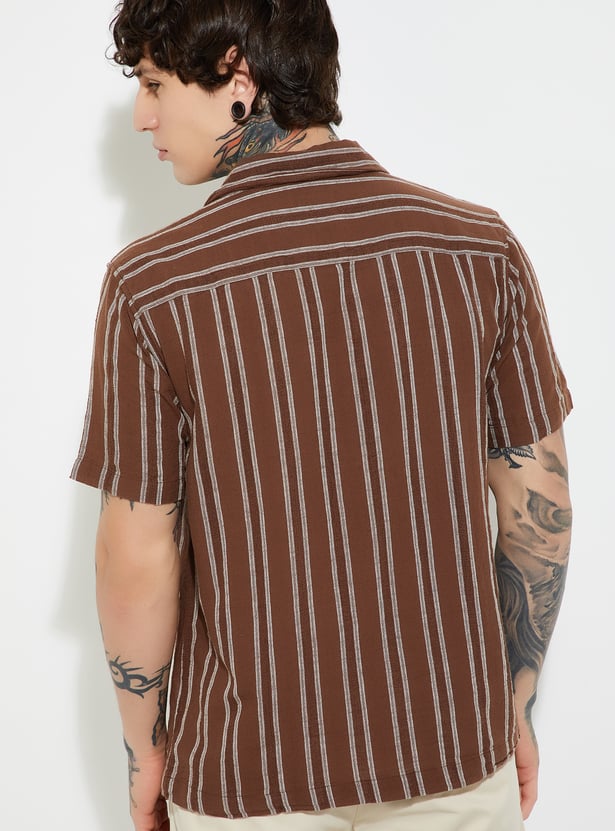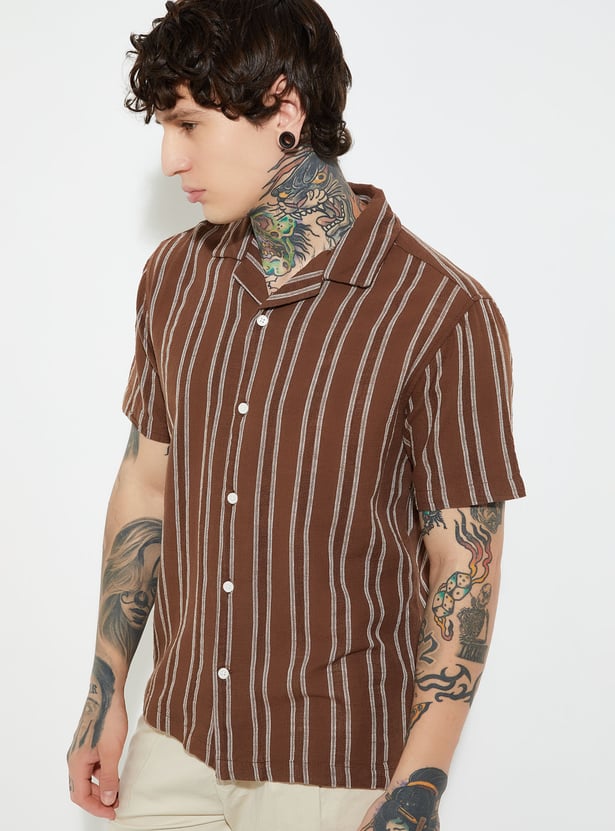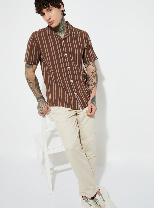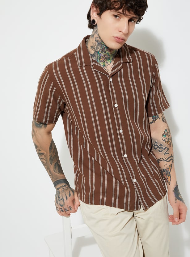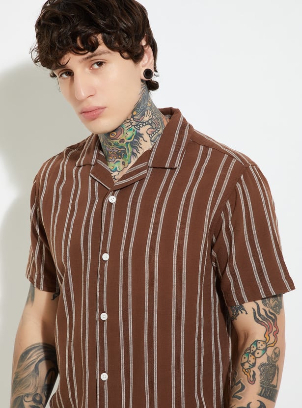 Stay relaxed and stylish in this striped regular fit resort shirt, featuring a button placket, resort collar, and half sleeves. Perfect for casual outings or vacation vibes.