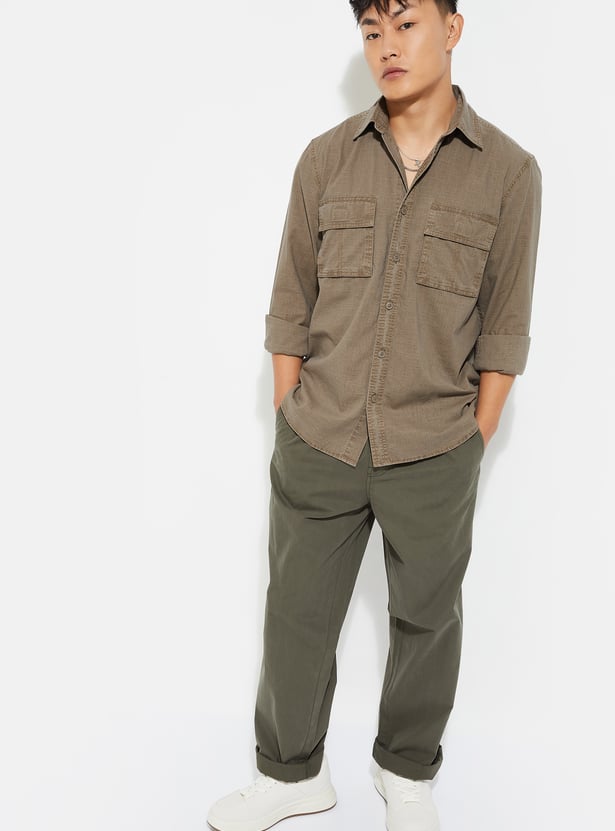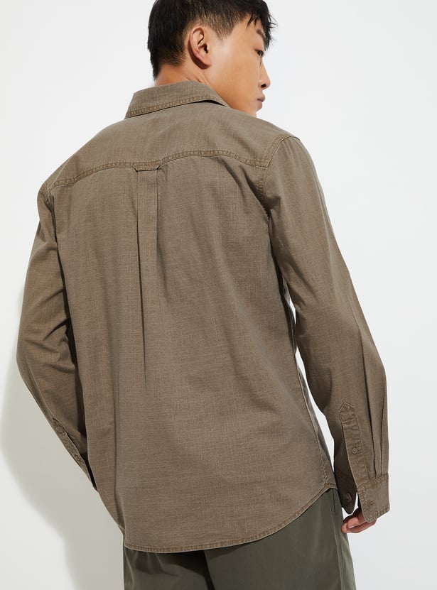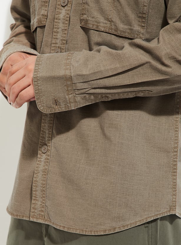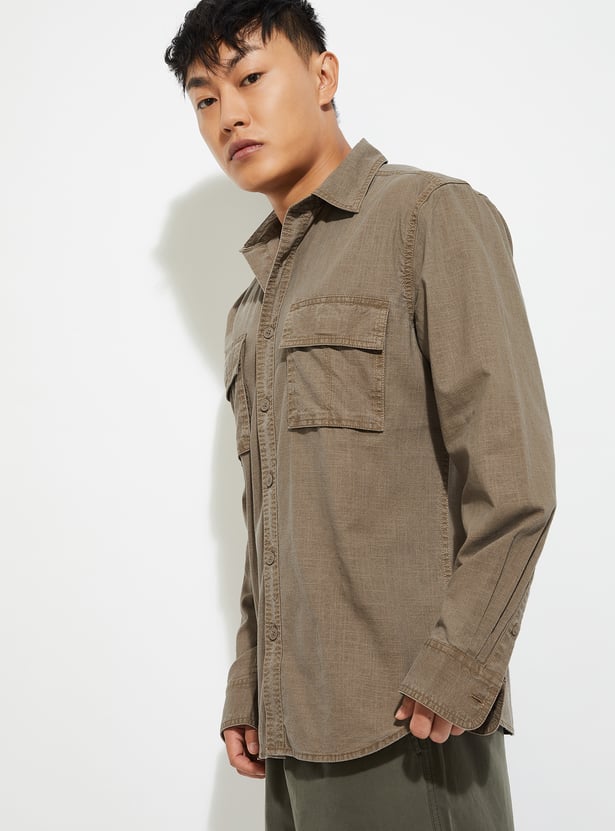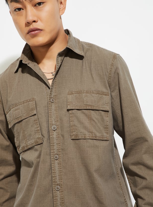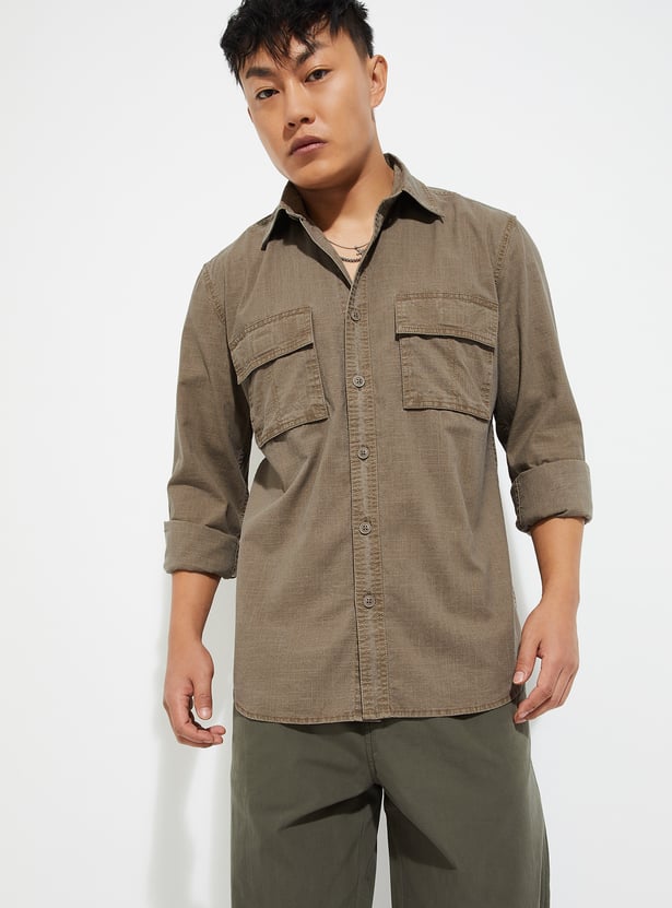 Sophisticated and versatile, this regular fit shirt features a spread collar, button placket, and full sleeves with button cuffs. The flap pockets add a utilitarian touch, while the textured fabric elevates the classic silhouette with subtle detail.
