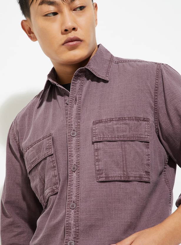 Sophisticated and versatile, this regular fit shirt features a spread collar, button placket, and full sleeves with button cuffs. The flap pockets add a utilitarian touch, while the textured fabric elevates the classic silhouette with subtle detail.