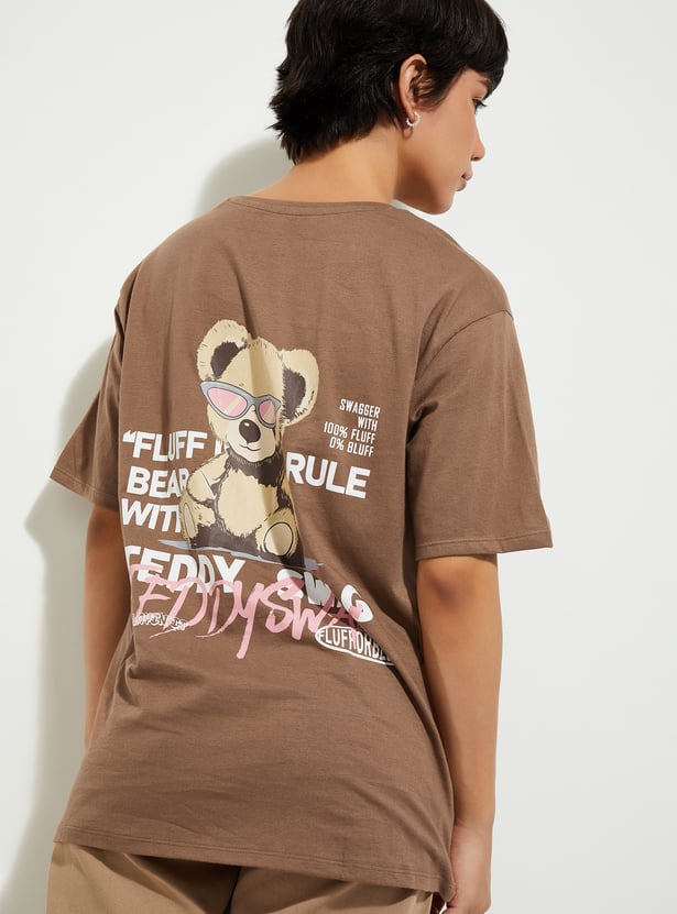 Cuteness personified, this T-shirt has got your back and your style. The sweet teddy bear graphics at the back adds a touch of whimsy, while the oversized fit ensures ultimate comfort. It has a crew neck and half sleeves.