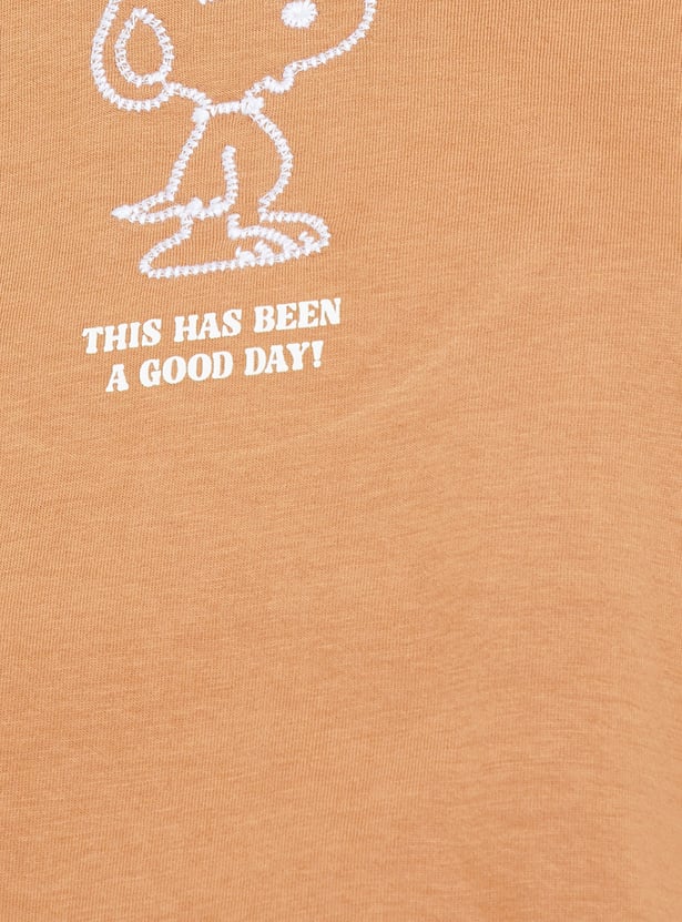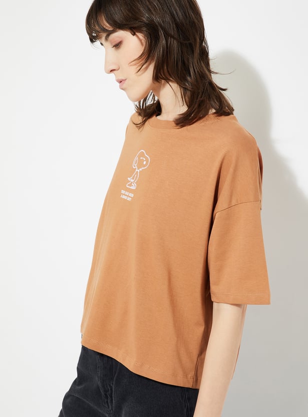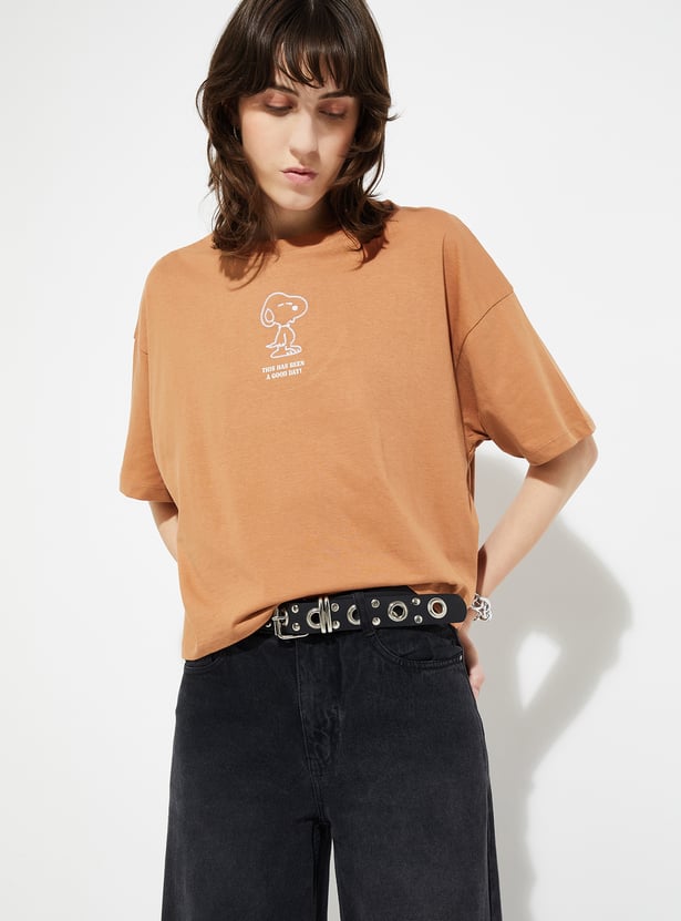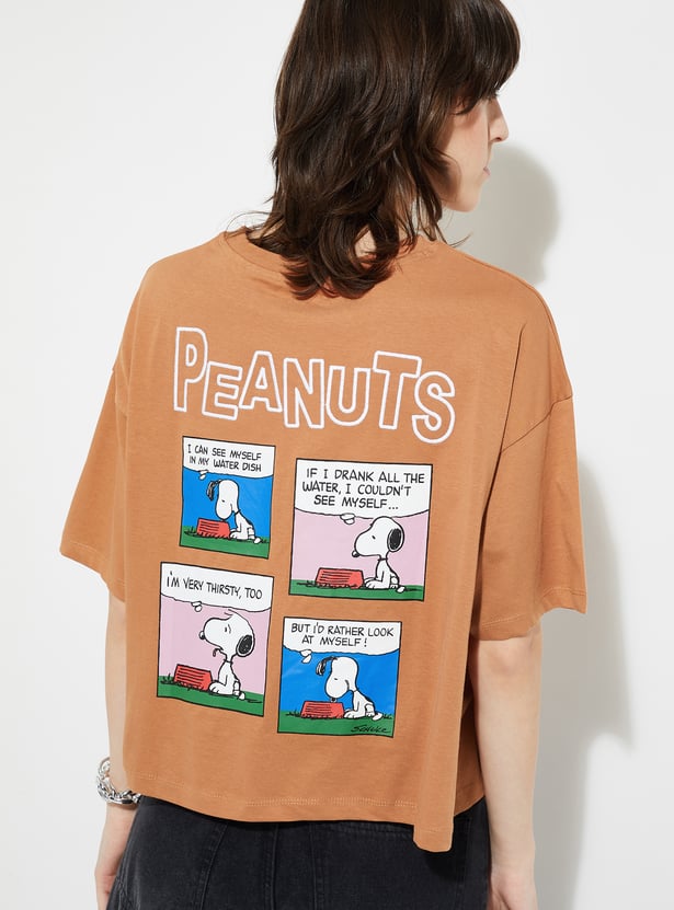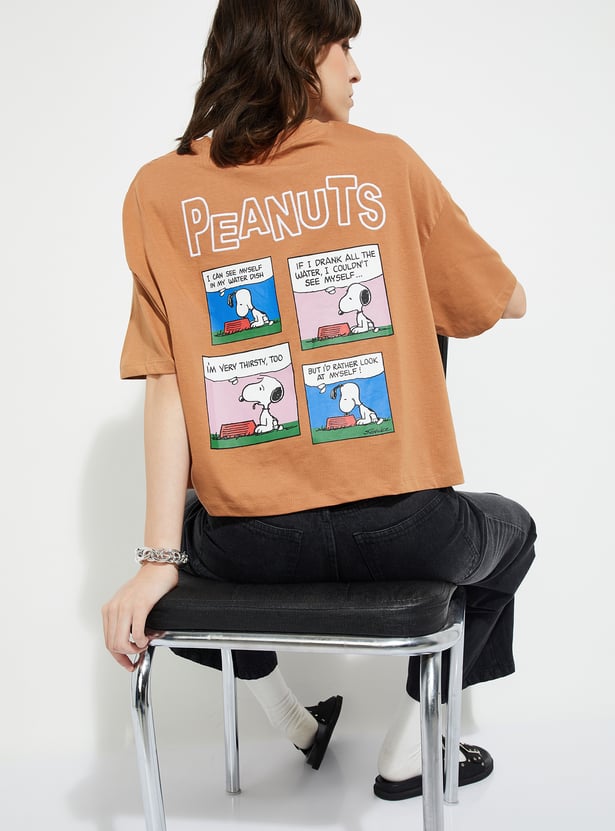 Show off your whimsical side with this Peanuts Snoopy print boxy fit T-shirt, featuring a charming graphic of everyone's favourite beagle and a classic round neck with breezy half sleeves. Designed for a relaxed fit, it perfectly combines nostalgia and all-day comfort with a fun, casual style.