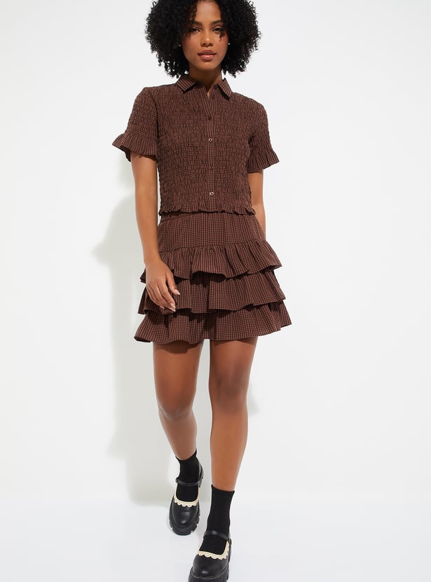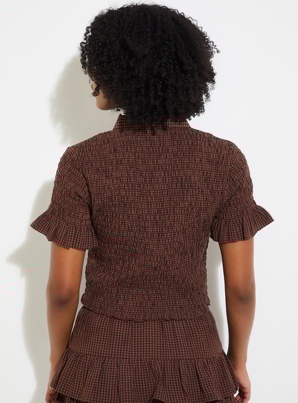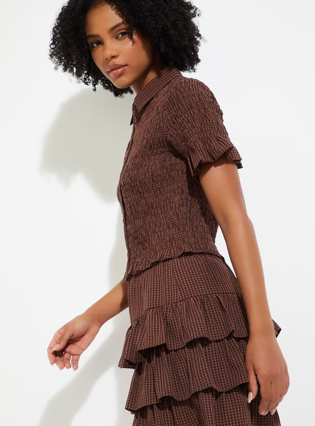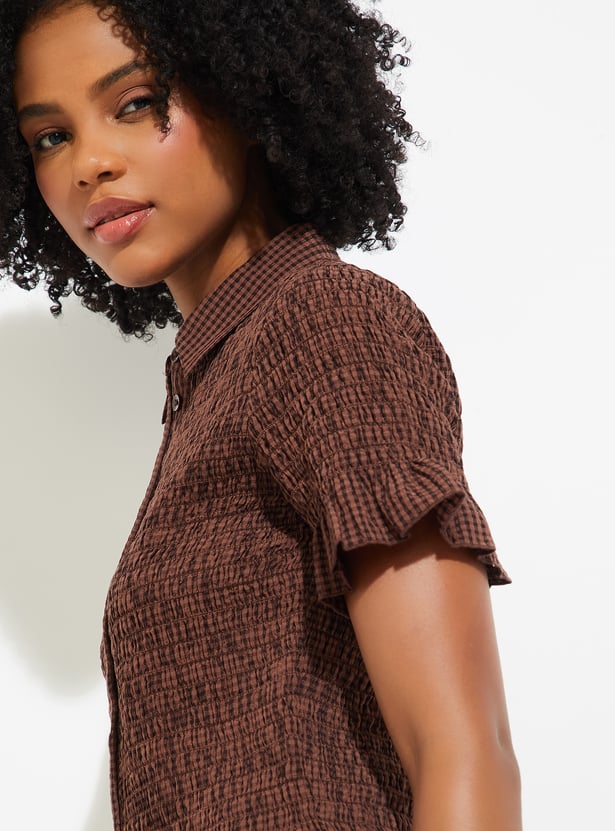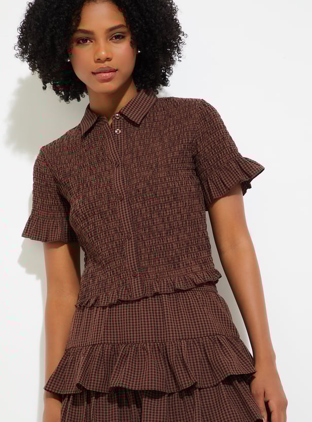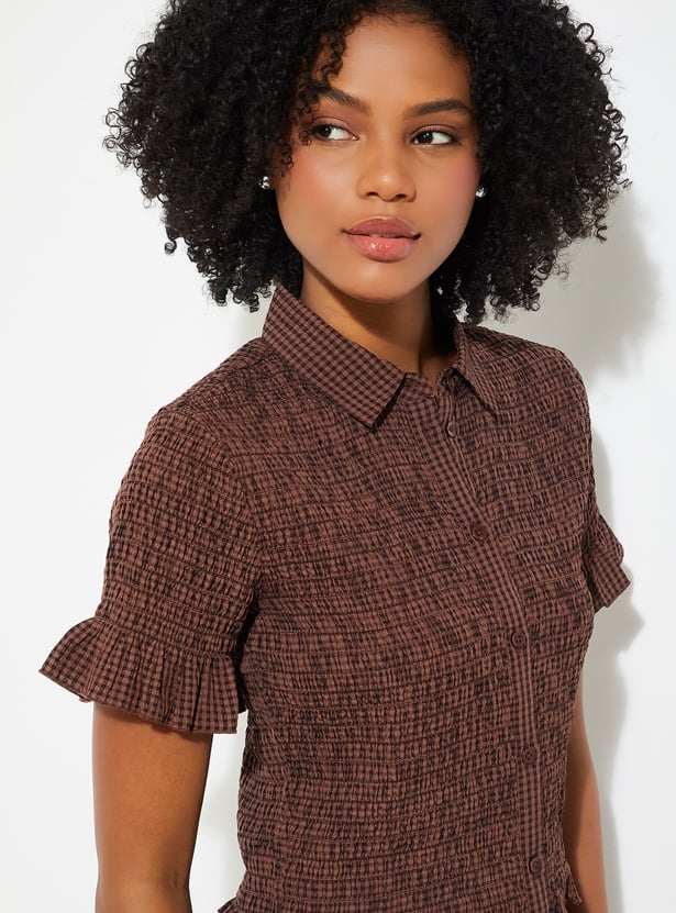 Add a touch of texture to your wardrobe with this smocked comfort fit shirt. Featuring a spread collar and button placket, it’s designed with half sleeves for a breezy, casual fit. The smocked detailing brings subtle style and comfort.