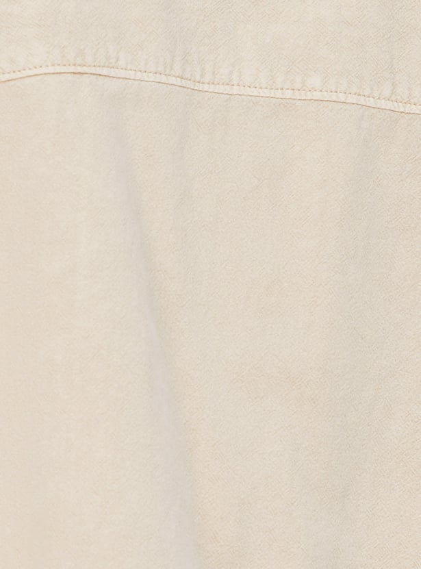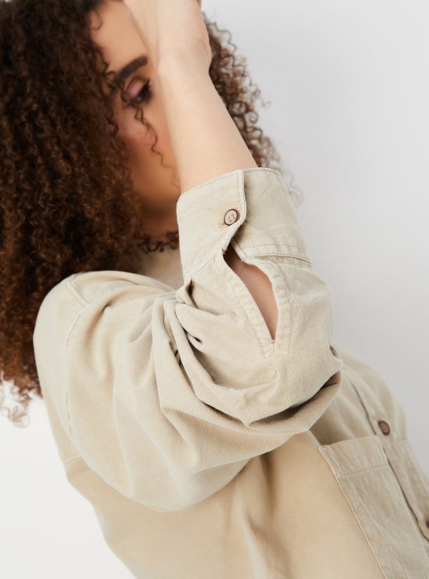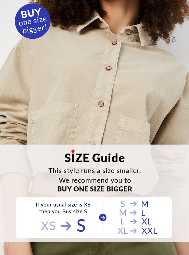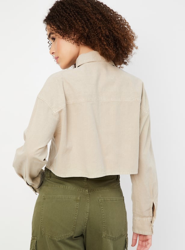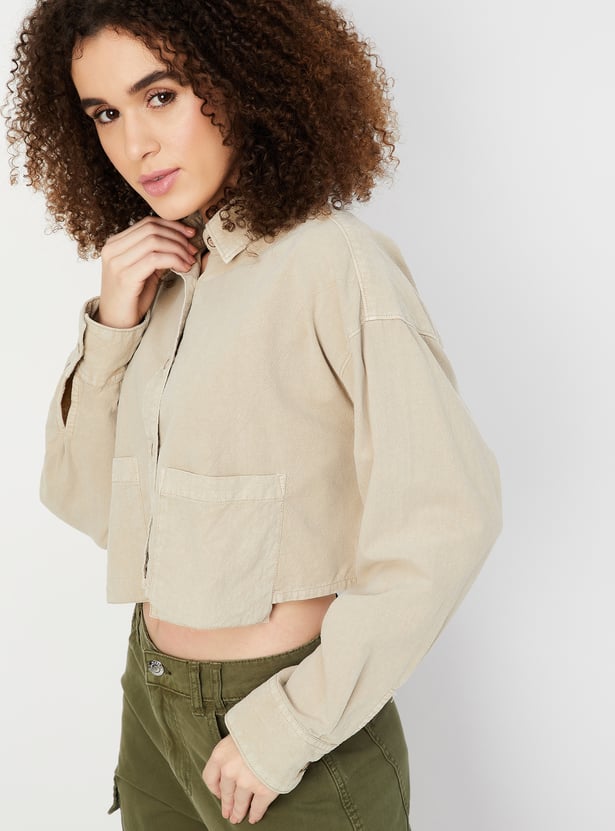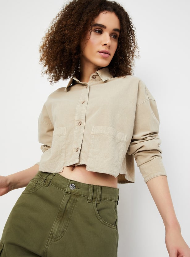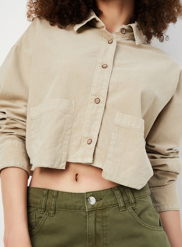 Keep it chic and casual with this boxy fit solid shirt with a cropped design, offering a modern, relaxed silhouette. Featuring a button placket and a classic spread collar, this shirt brings timeless style with a contemporary twist. The addition of patch pockets adds a functional detail to the minimalist look.