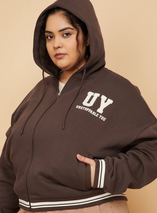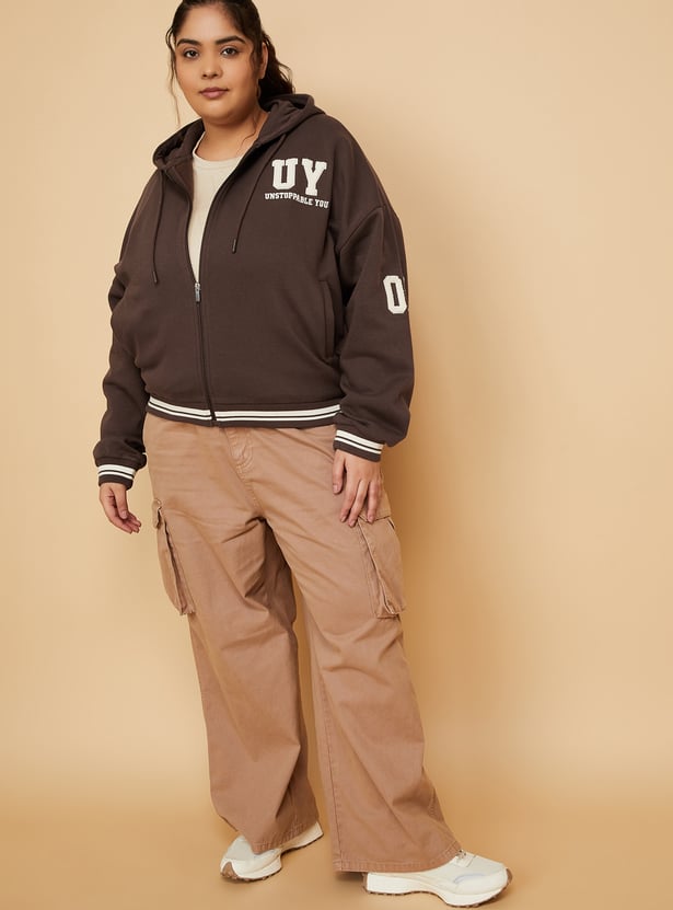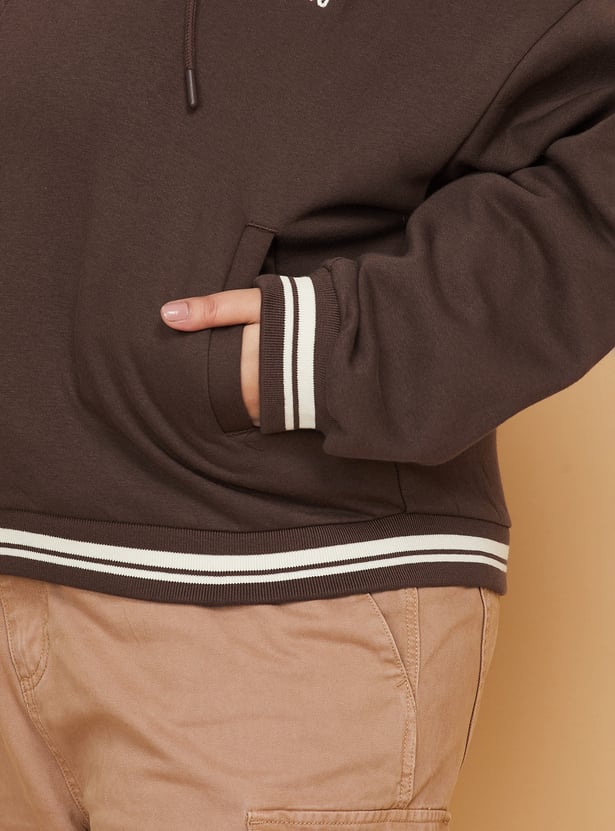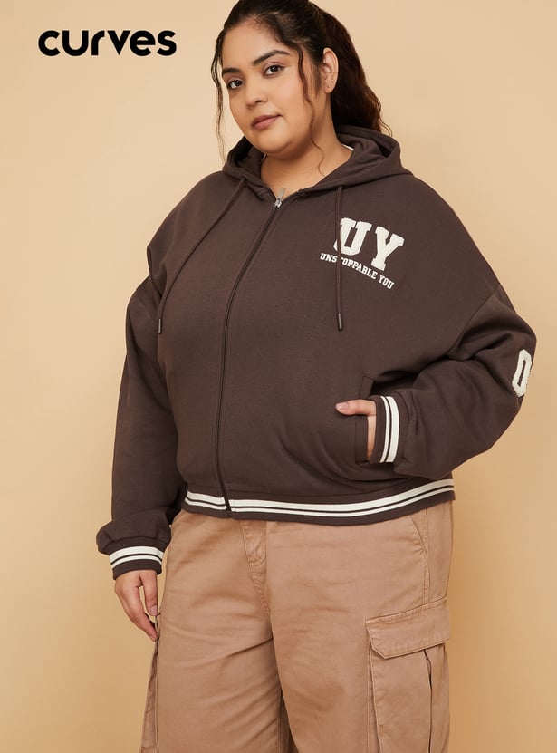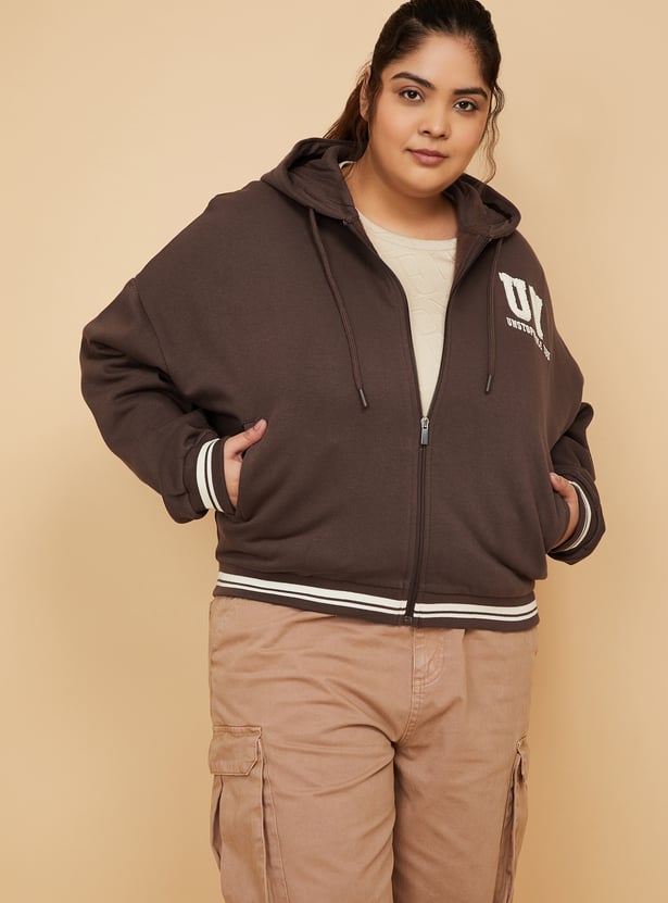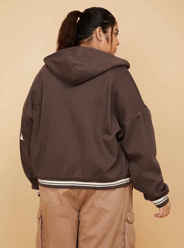 This boxy varsity jacket combines style and comfort with full sleeves, a hood, and front insert pockets. It’s perfect for layering over casual outfits. Model Size :
