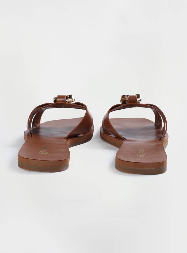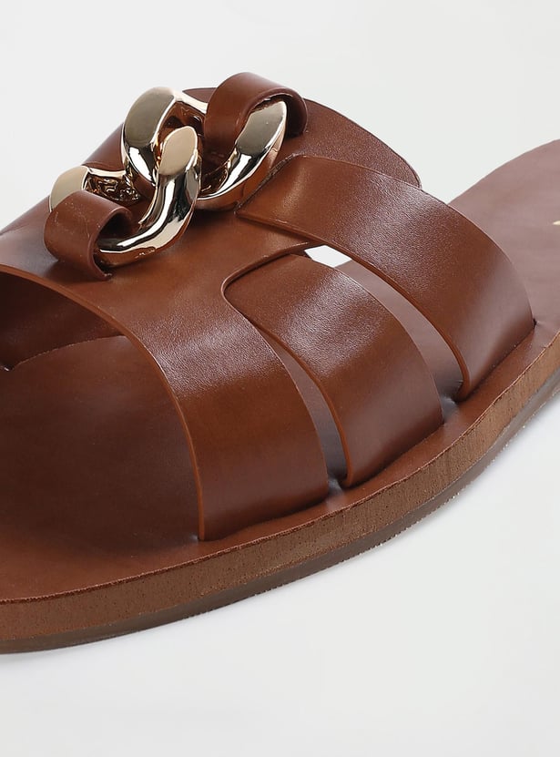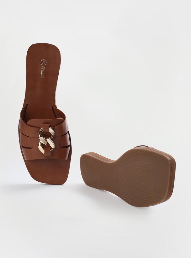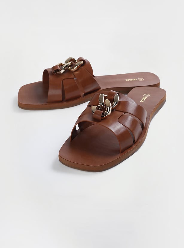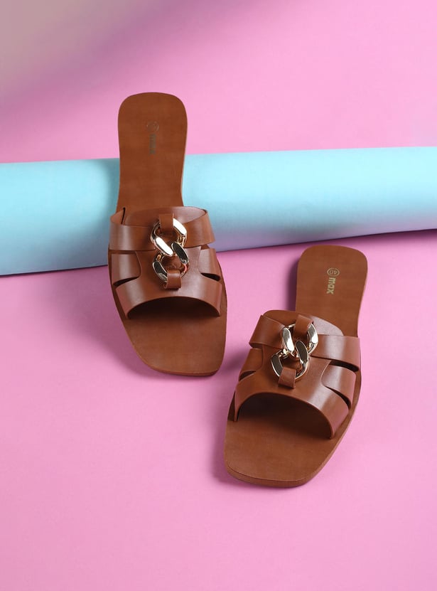 Amp up your style quotient with this pair of sandals. It features a square open toe, chain detail on the upper, a comfortable footbed, and a durable outsole.