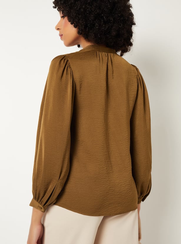 Add a touch of elegance with this crinkled satin finish blouse, featuring a chic band collar, button closure, and puffed full sleeves with cuffed ends. A perfect blend of classic style and modern texture.