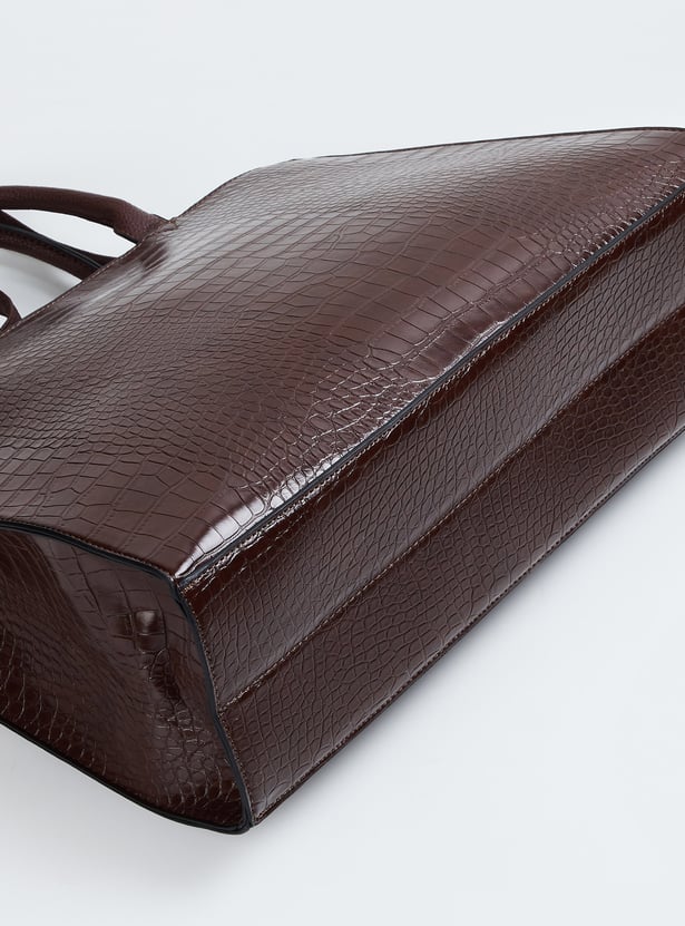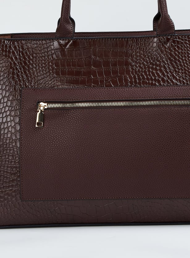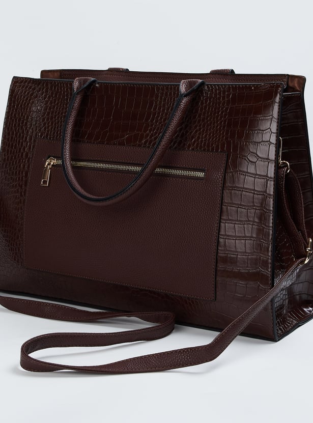 Boost your style with this croc-textured handheld bag. It features a twin handle, an adjustable strap, a zip closure, and two compartments with an external pocket.