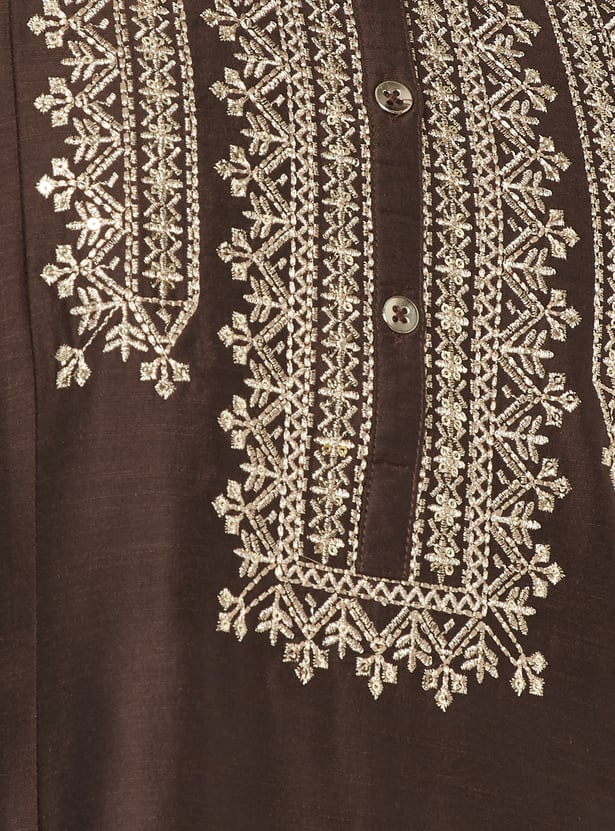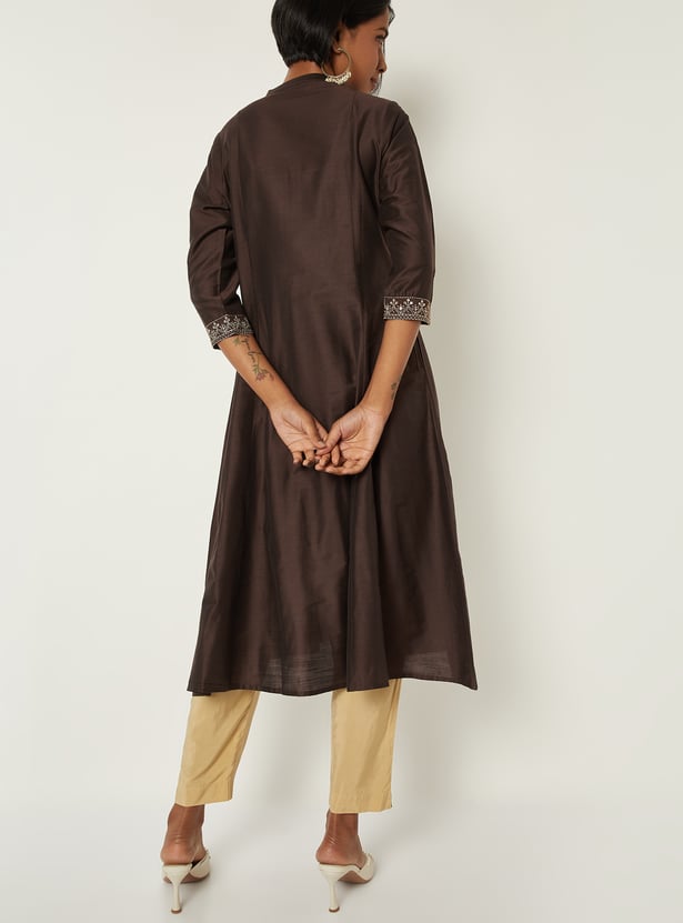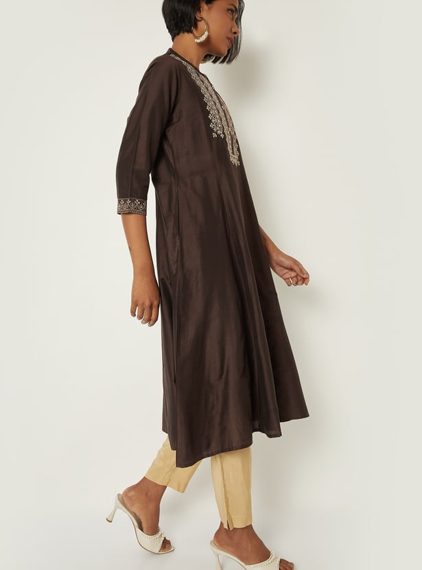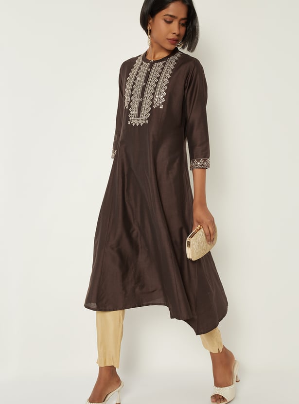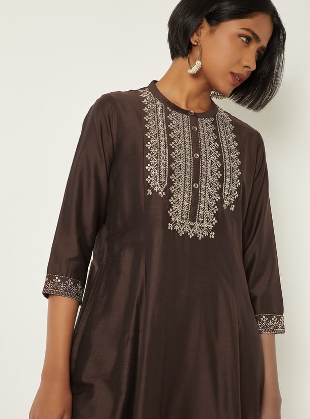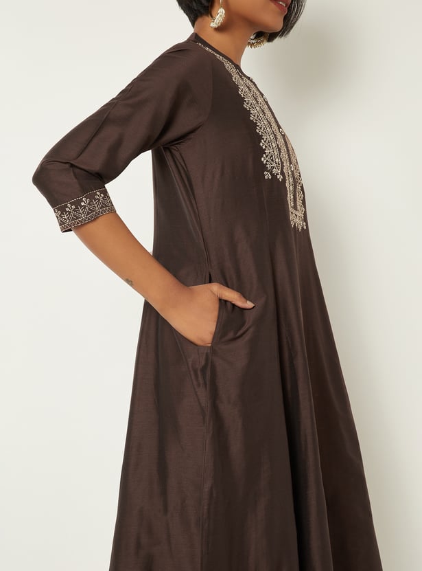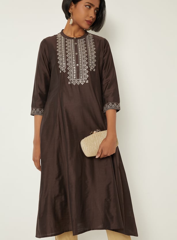 Elegant and versatile, this embroidered A‑line kurta features a band collar, three‑quarter sleeves, and a handy pocket for a refined yet functional look.