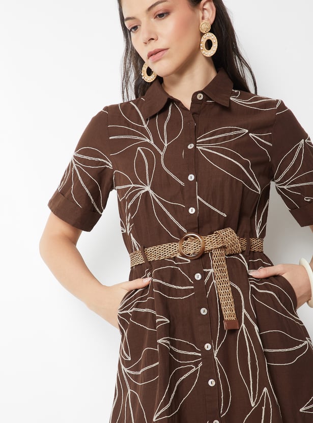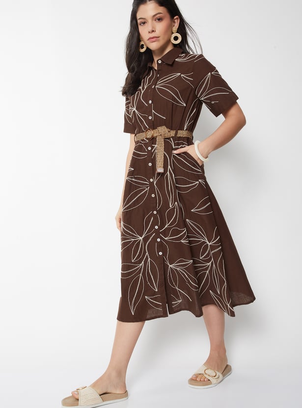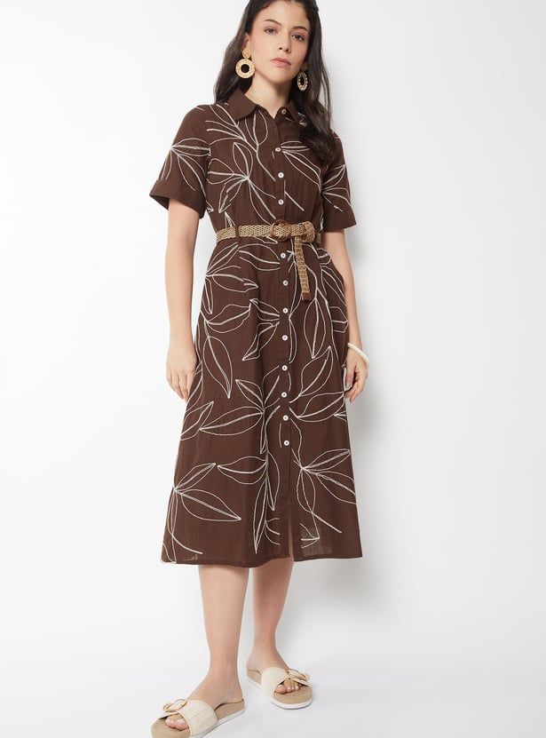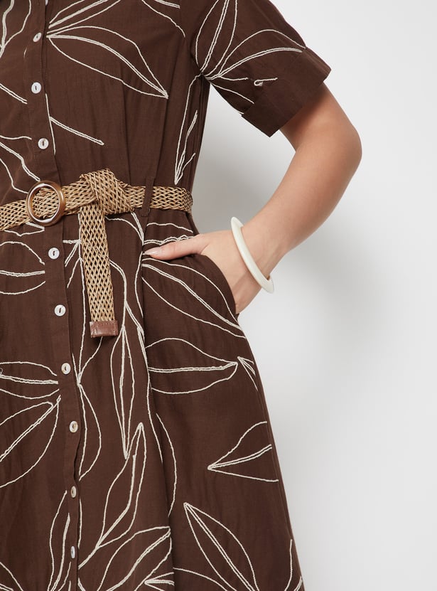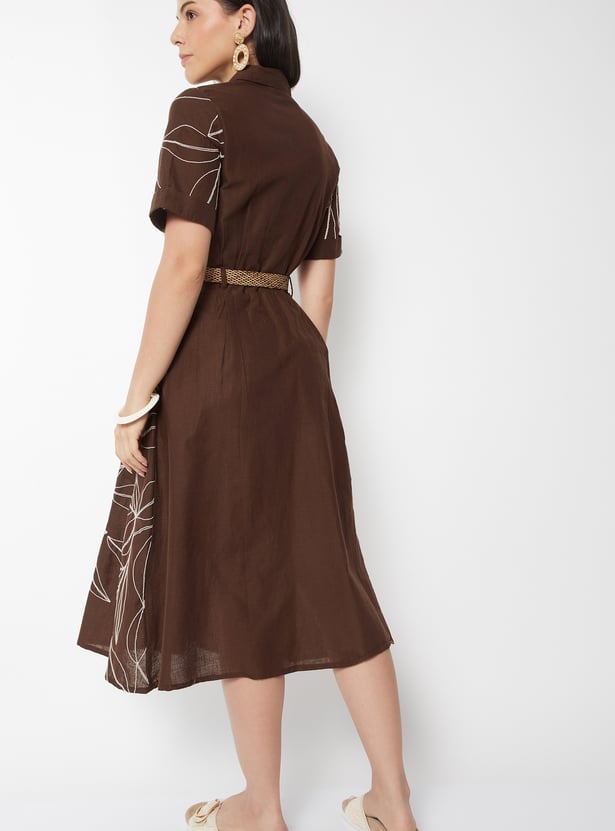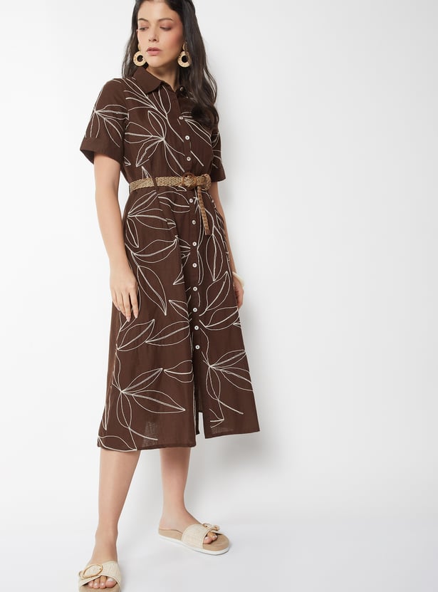 Women Embroidered Belted Shirt Dress
