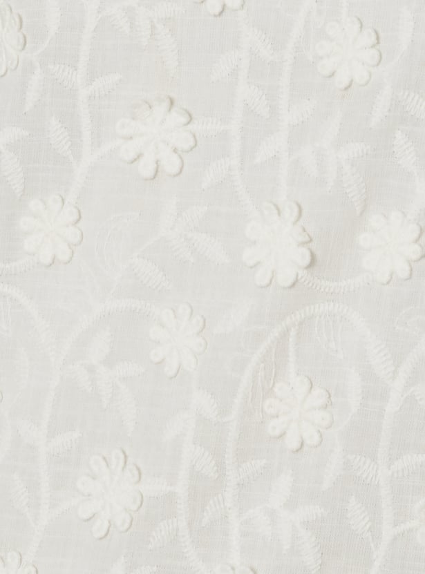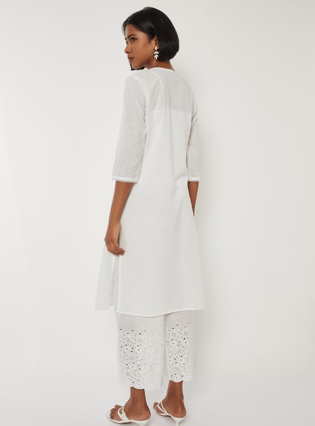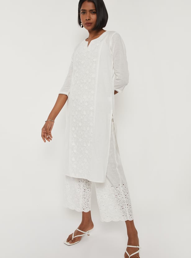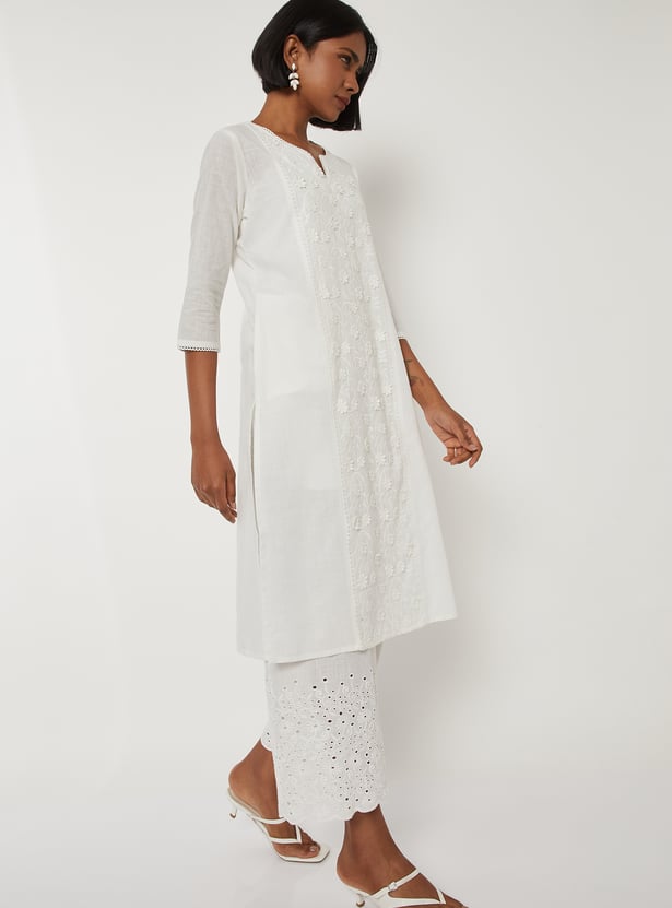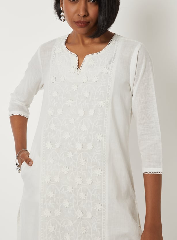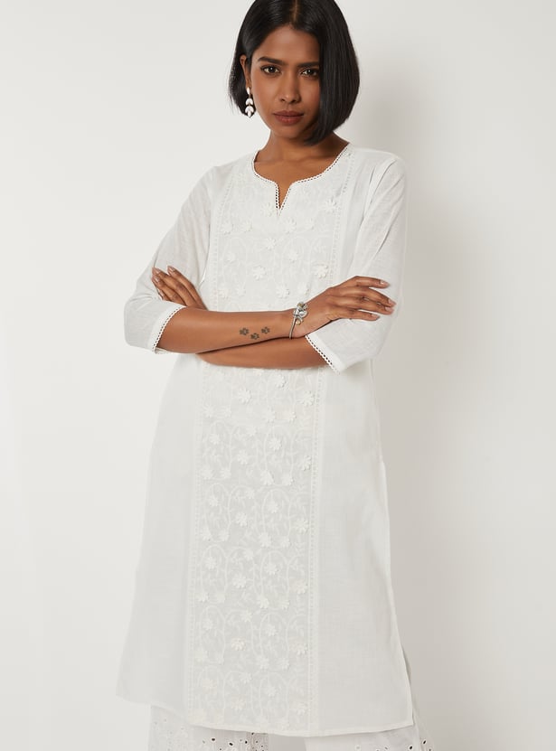 Elevate your ethnic staples with this floral applique and embroidered straight kurta featuring a classic notch neckline, 3/4th sleeves, a side pocket, and easy side slits for comfort.