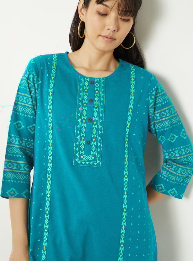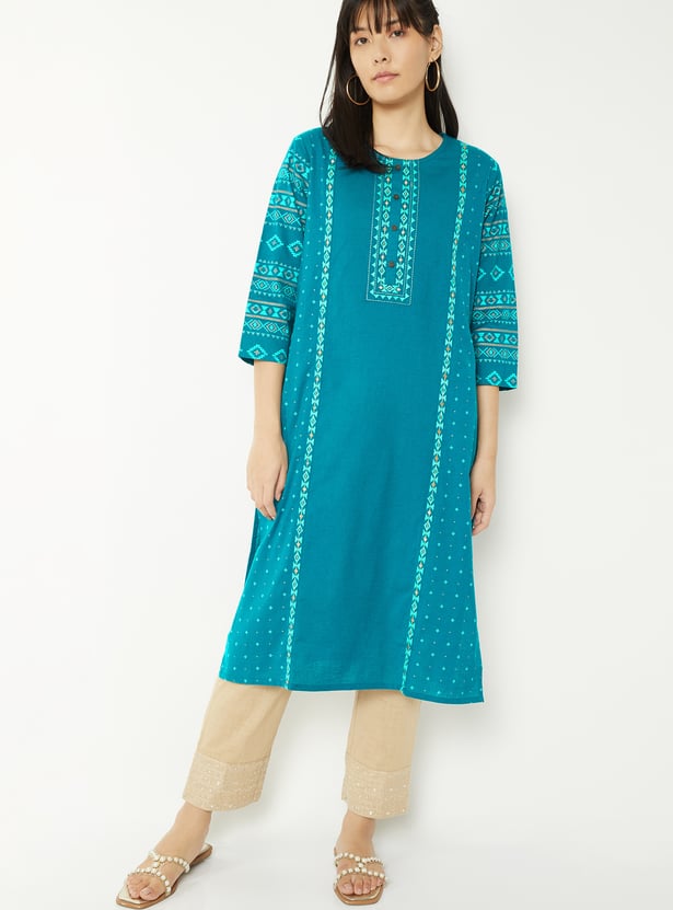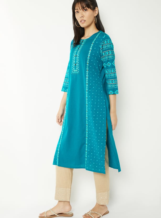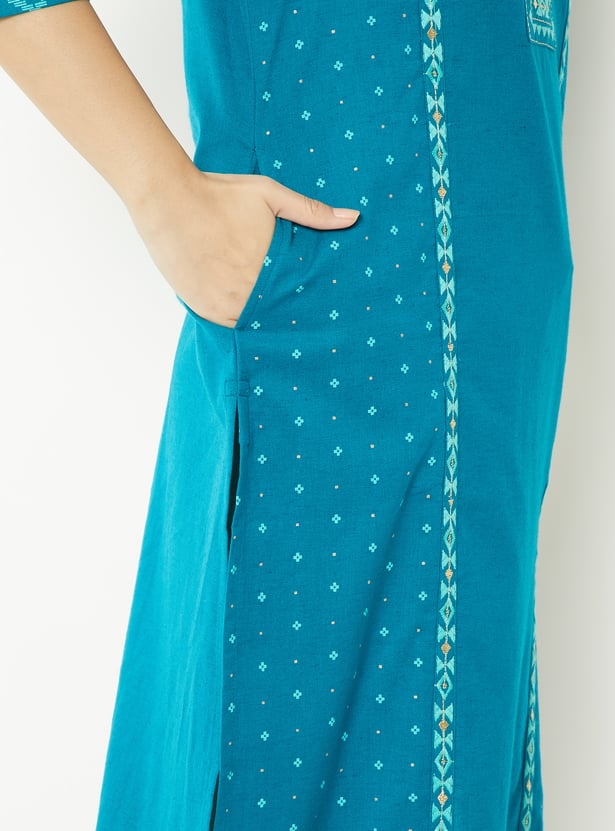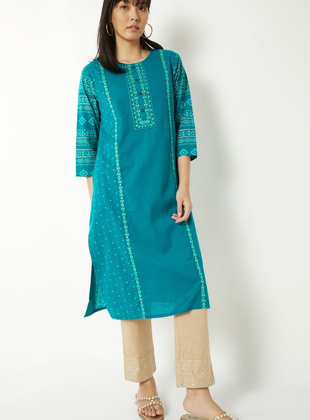 This embroidered straight kurta is a refined blend of elegance and ease. Featuring a flattering round neck and 3/4th sleeves, it offers a comfortable fit with a touch of sophistication. Side slits add graceful movement,