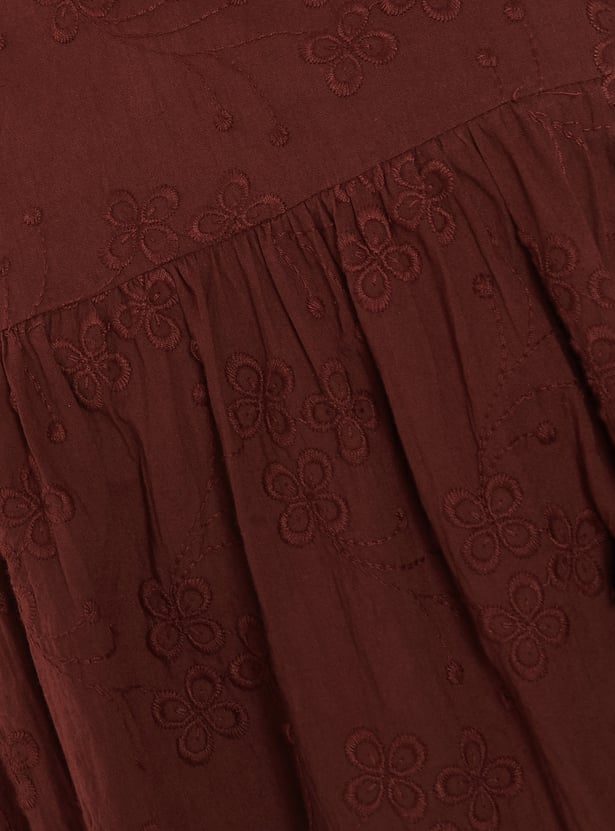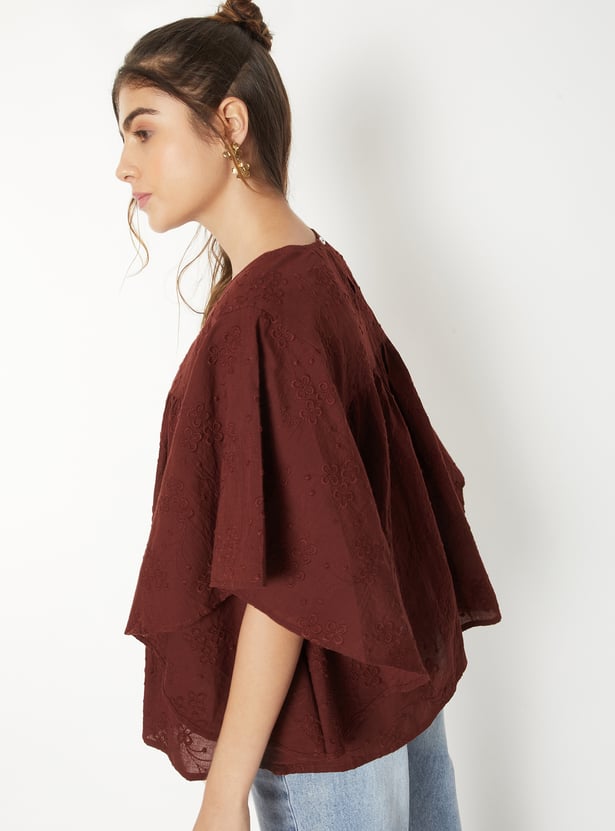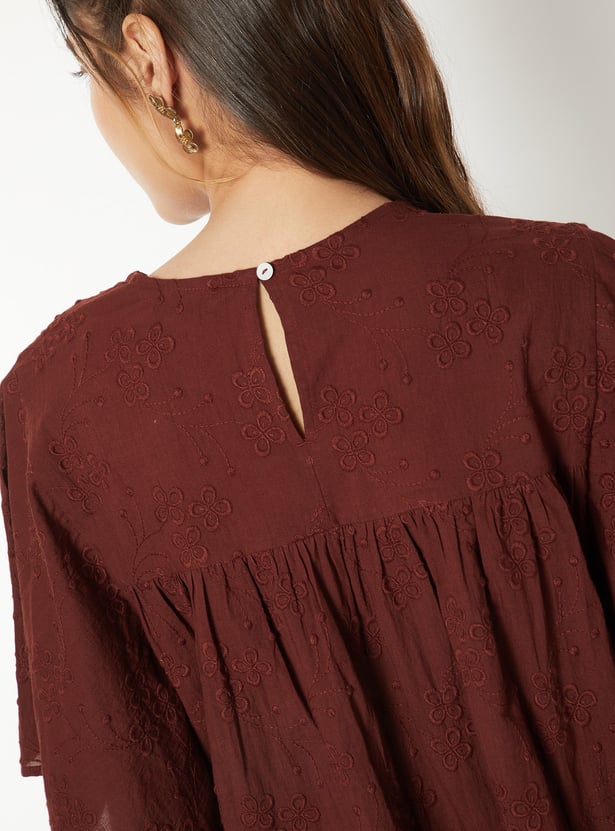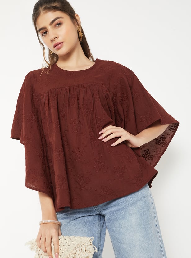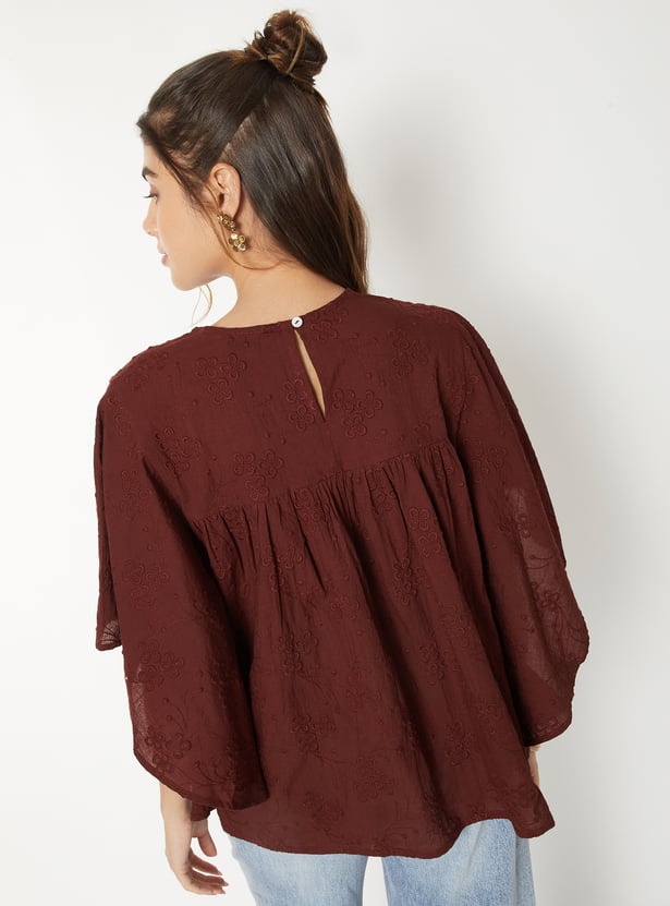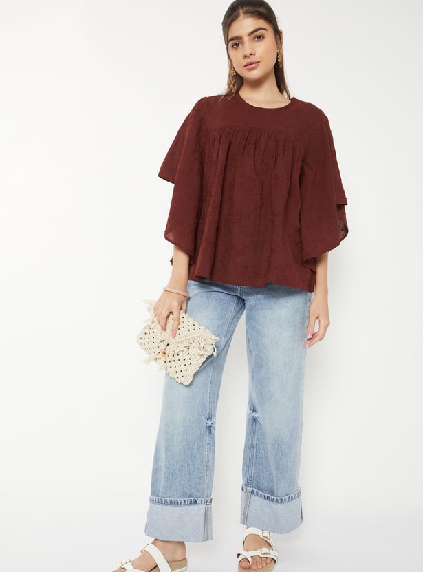 Add a graceful update to your wardrobe with this embroidered tunic, designed with a classic round neck and a neat button closure. The flared sleeves enhance its flowy silhouette, while the delicate embroidery adds a touch of elegance.