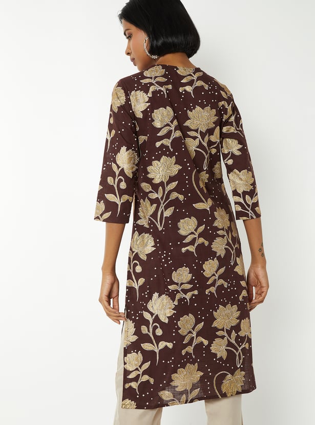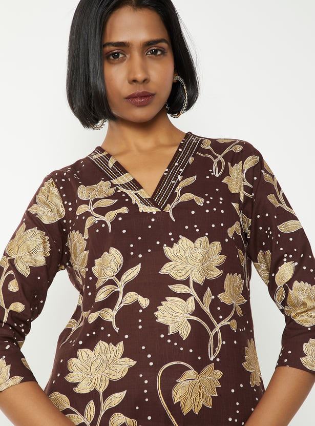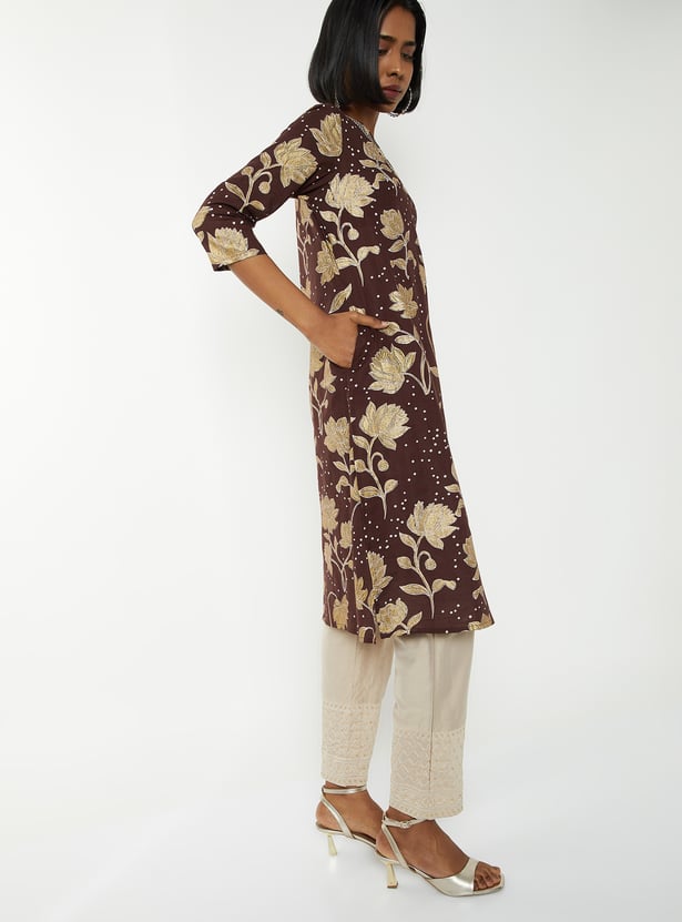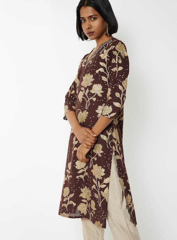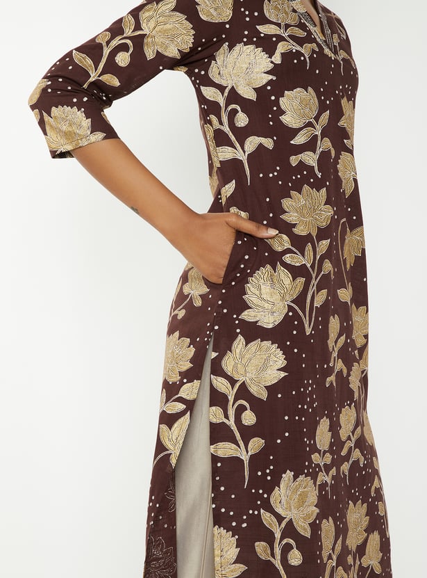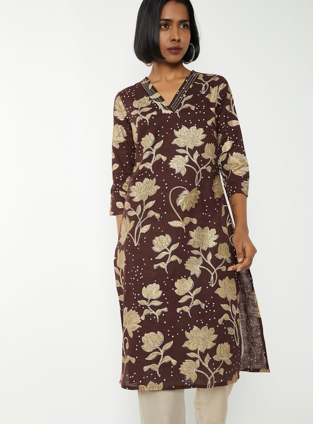 Step out in graceful style with this floral print straight kurta. Featuring a V-neck, side pockets, and side slits, it combines elegance with a comfortable fit.
