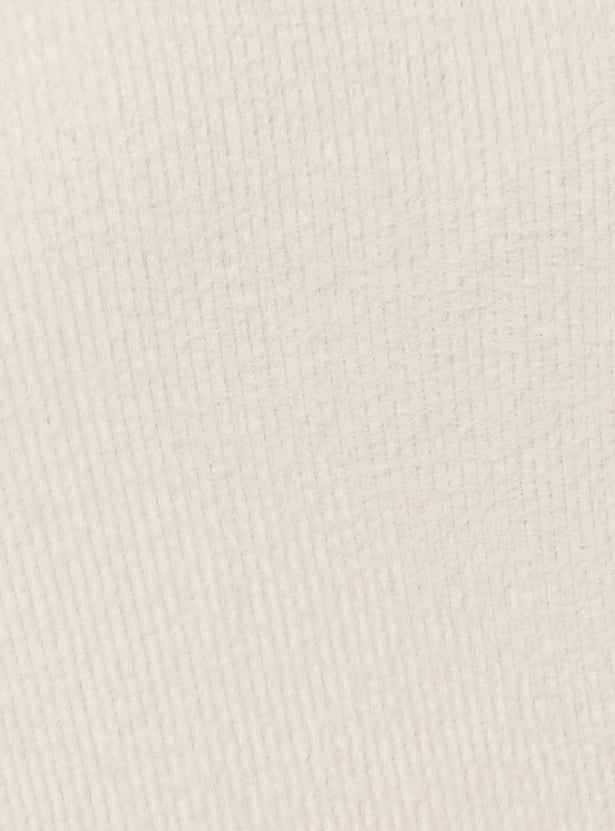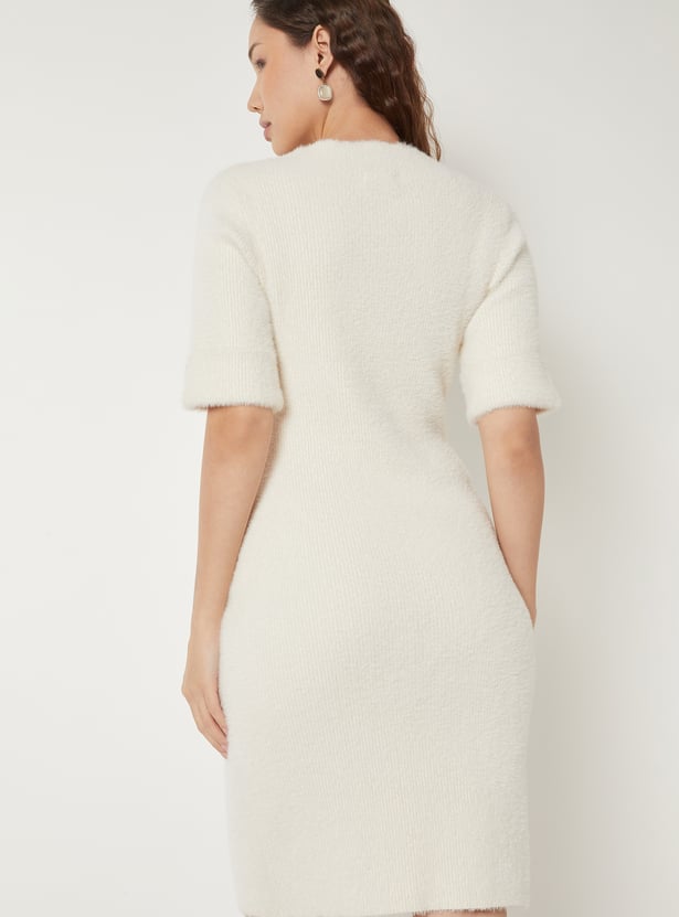 This fitted, knitted bodycon dress features a fancy, feathery-like texture, with a round neck and half-sleeves that have buttoned, rolled-up cuffs. Elegant and comfortable for day-to-night wear.