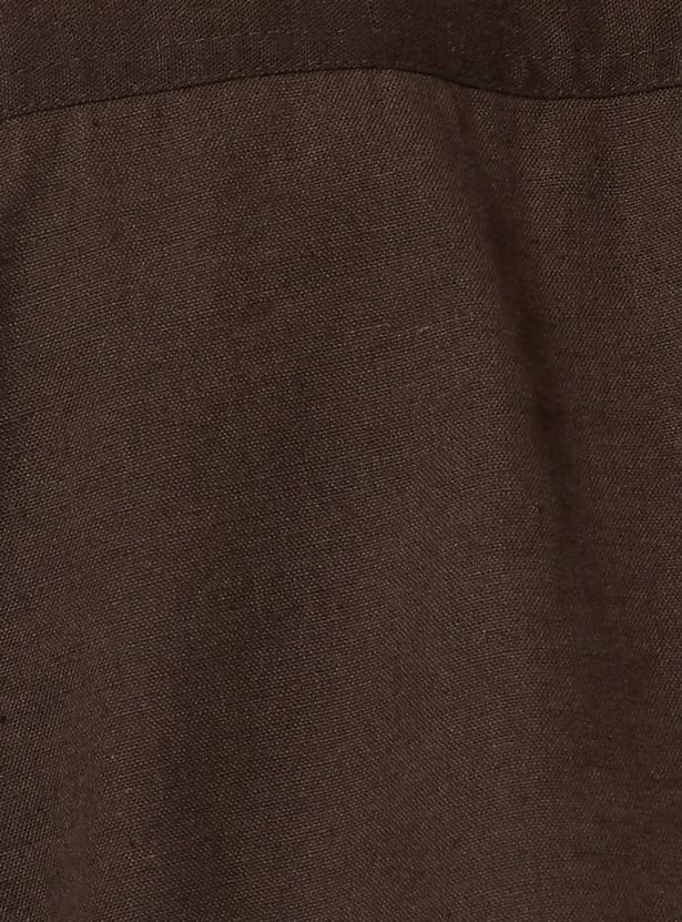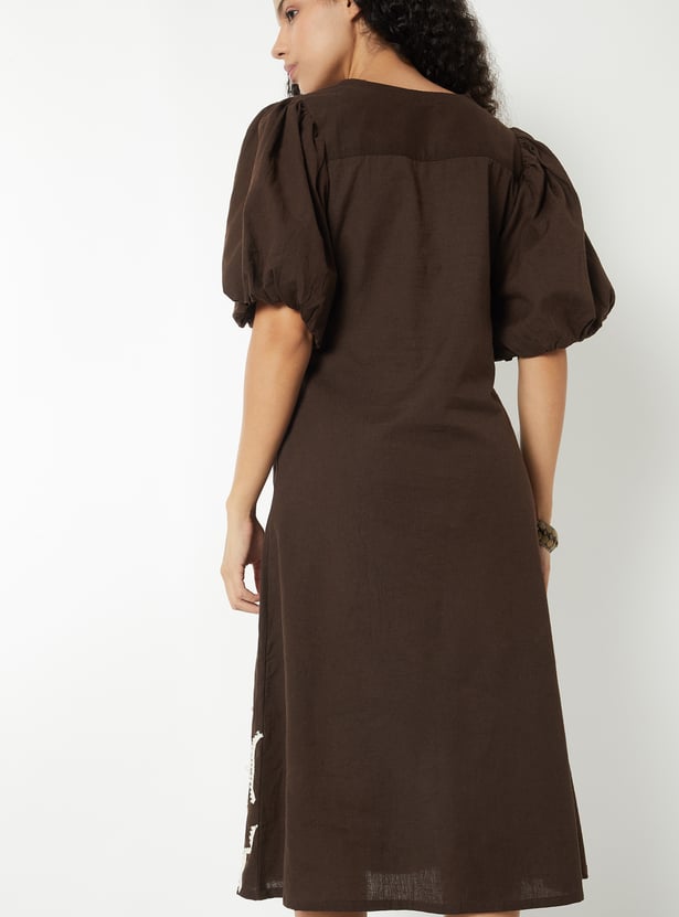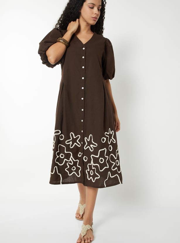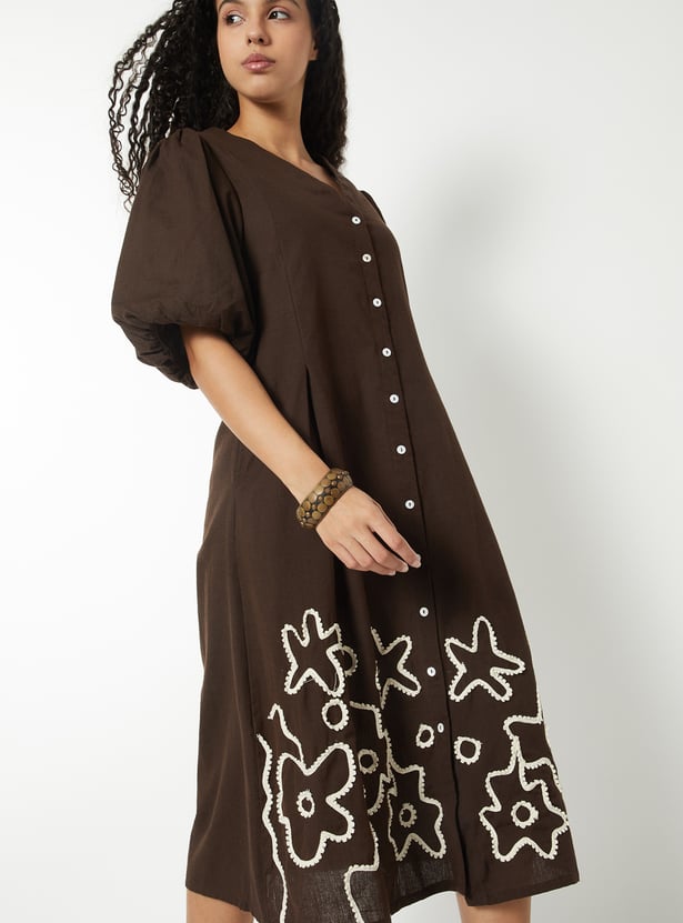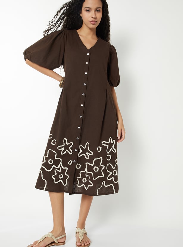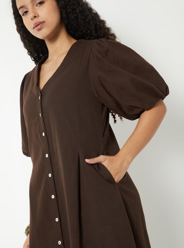 This womens' printed dress features a clean V-neckline, button-down front, and elegant princess-line pleat detailing. Designed in an A-line fit with elbow-length puff sleeves, elasticated openings, and pockets on both sides, it blends structure with feminine charm.