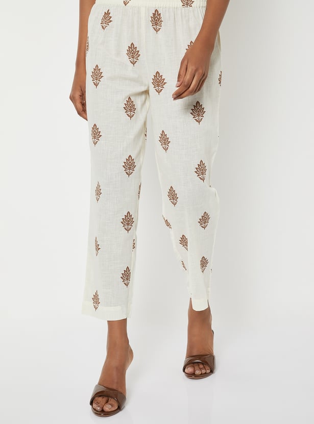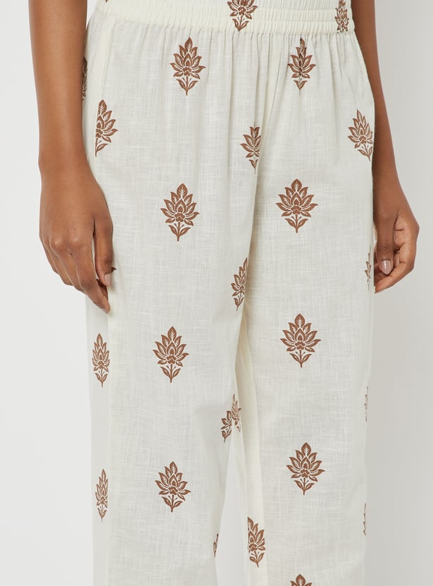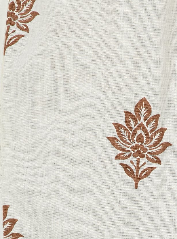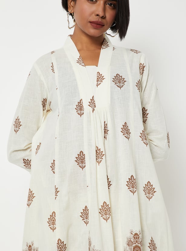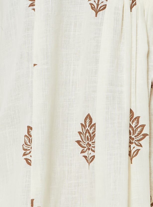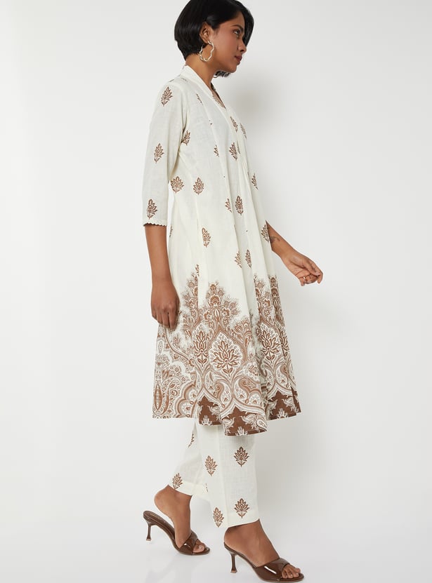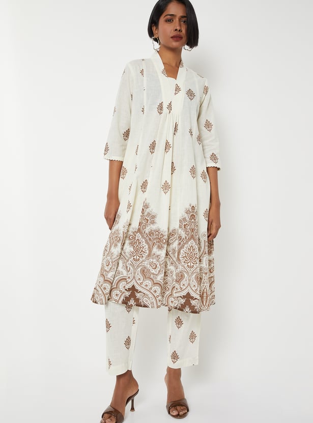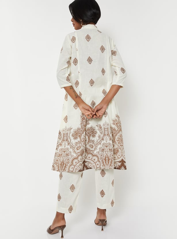 Elevate your ethnic style with this printed A-line kurta set, featuring a stylised neck, chic 3/4th sleeves, and a practical side pocket. Paired with straight pants with an elasticated waist, it offers the perfect blend of comfort and charm.