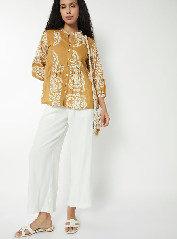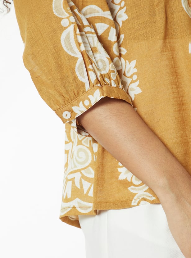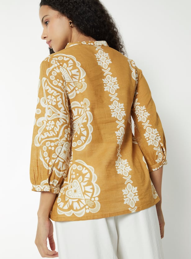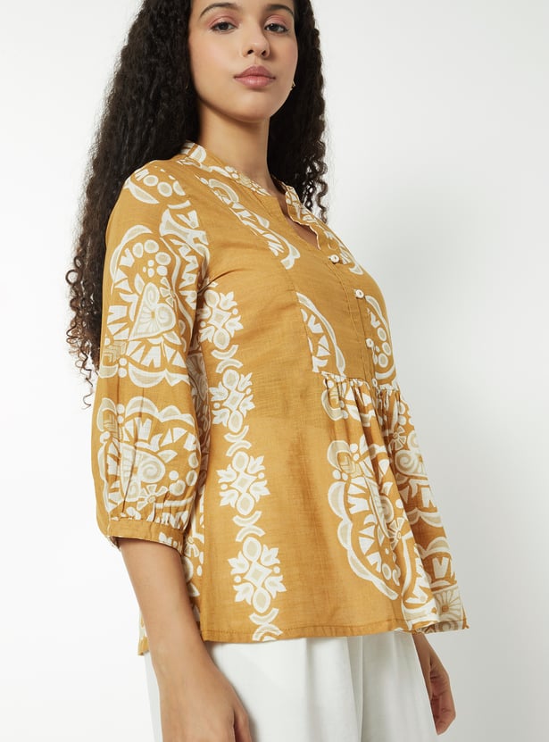 This printed tunic features a band collar, button-down front, and 3/4th gathered sleeves. The relaxed silhouette and refined detailing make it a versatile piece for both casual and polished looks.