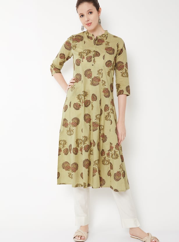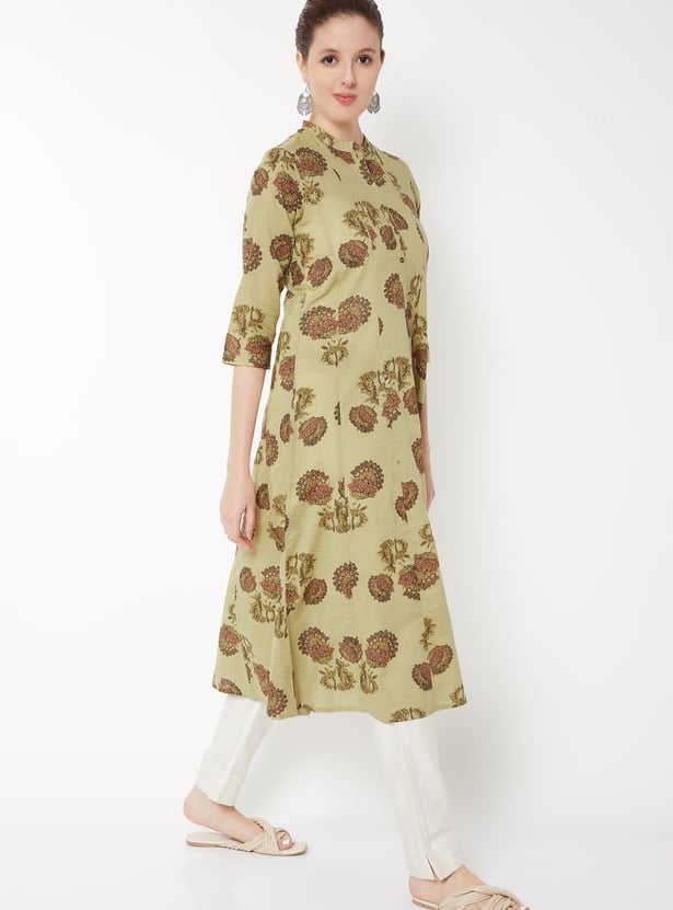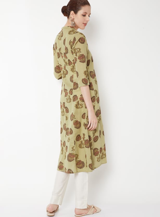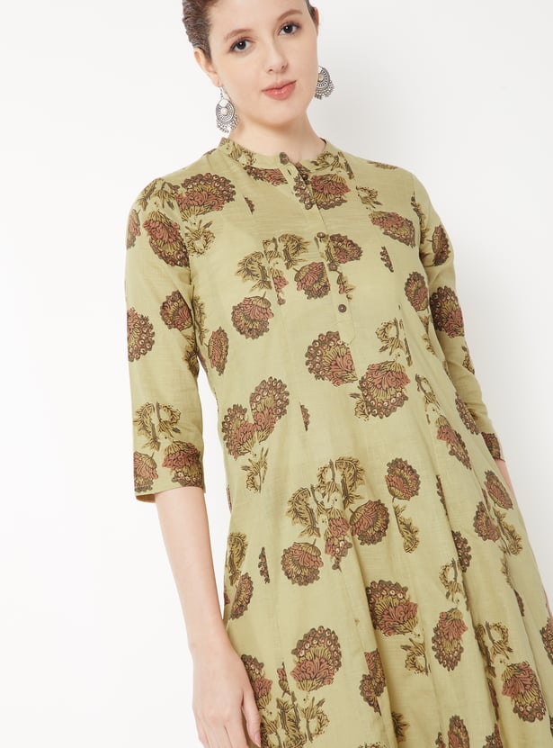 Elevate your ethnic wardrobe with this elegant printed Kalidar kurta. Featuring a stylish Mandarin collar and 3/4th sleeves, it offers a graceful look. The intricate design and comfortable fit make it perfect for daily wear or casual occasions.