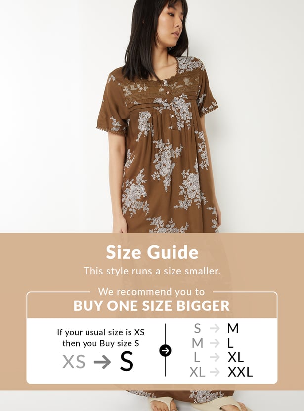 Stay cozy and stylish with this printed night gown. Featuring a round neck, button placket, and half sleeves, it offers both comfort and ease for restful nights. The playful print adds charm, making it a perfect blend of practicality and design. Model Size :