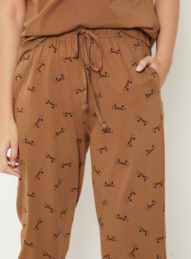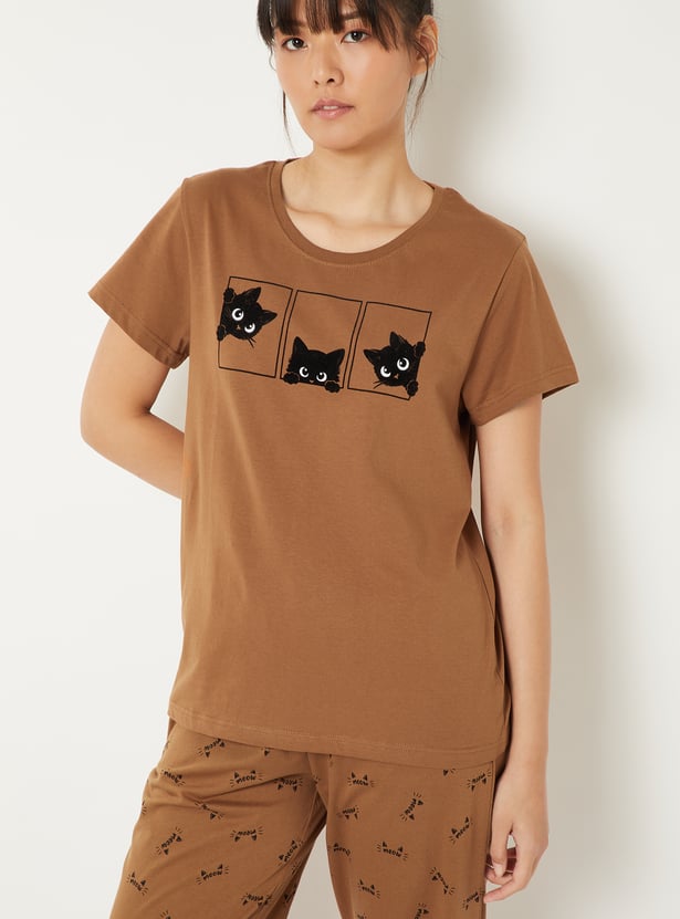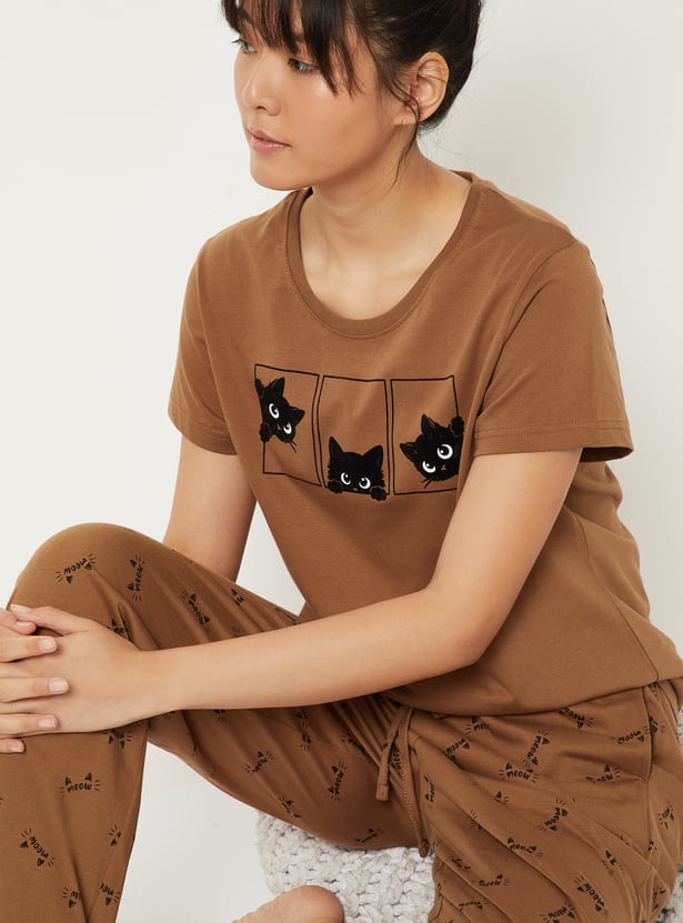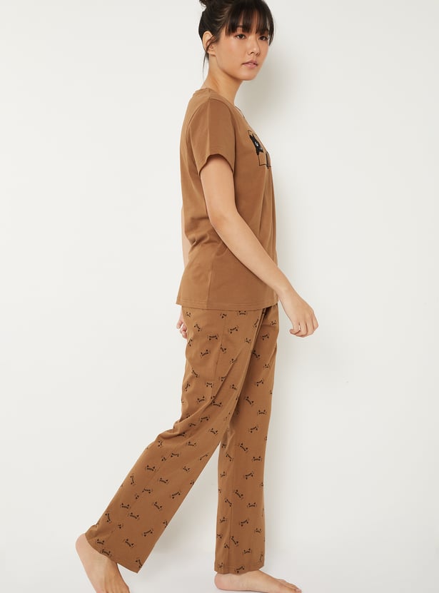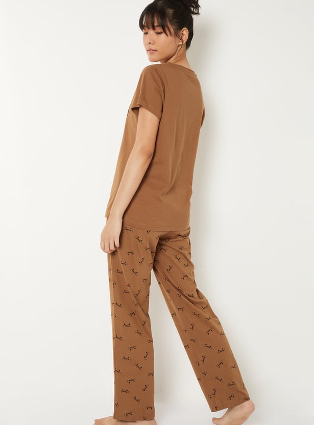 Relax in style with this printed pyjama set! The soft, round-neck, half-sleeve t-shirt pairs perfectly with printed pyjamas featuring a comfy drawstring closure. Model Size :