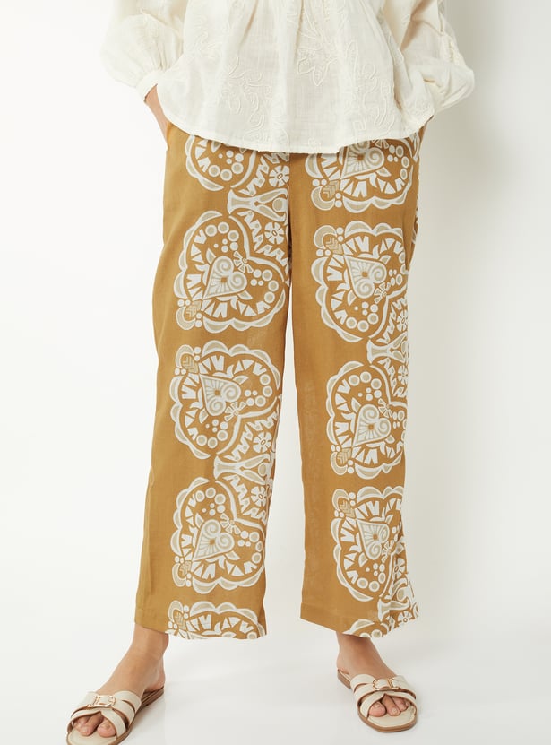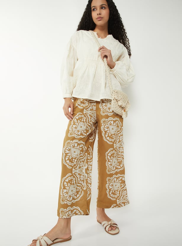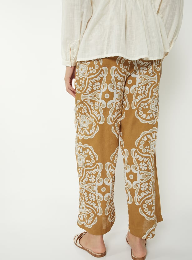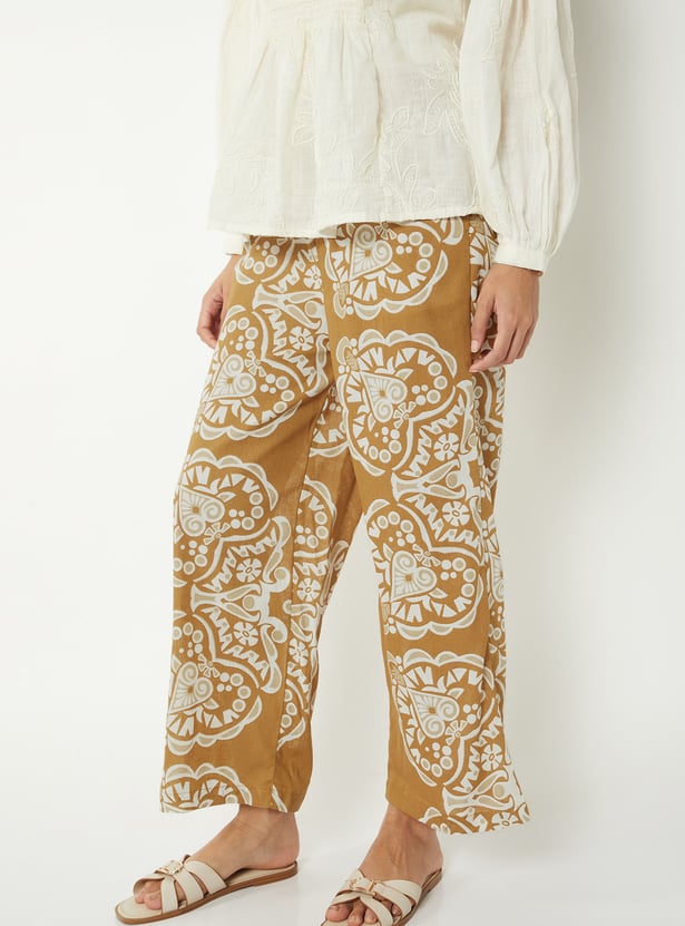 These printed palazzos feature a front-flattened waist and an all-over print that adds vibrant flair. The flared silhouette offers easy movement and a breezy, stylish finish.