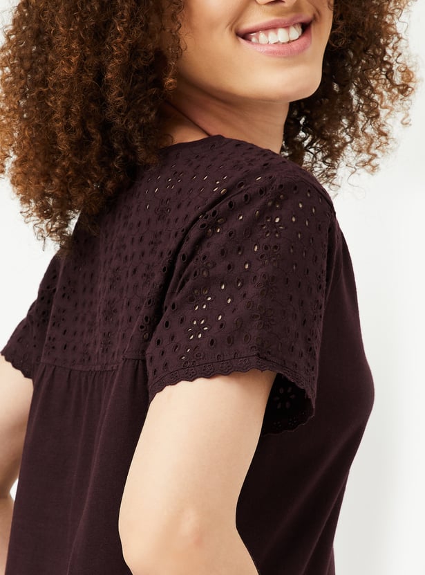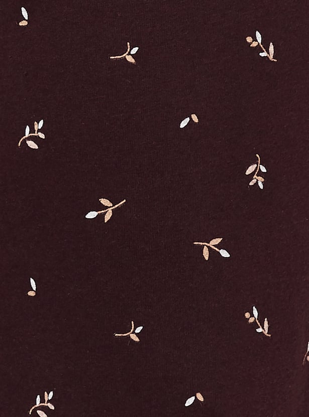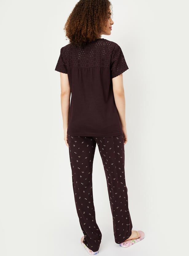 Clock a good night’s sleep in this pyjama set. The set features a solid-tone T-shirt with tonal schiffli embroidered sleeves and a back yoke for a unique touch. The pyjamas showcase nature-inspired all-over prints and a convenient drawstring waist for a customisable fit.