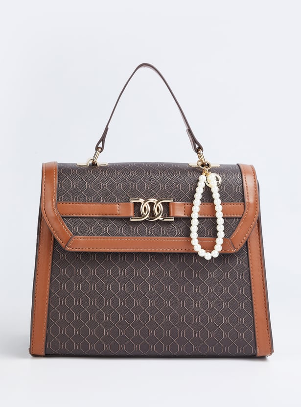 Add a playful touch to your look with this printed satchel bag, featuring a sling strap, snap button closure, and a charming pearl loop detail on the front.