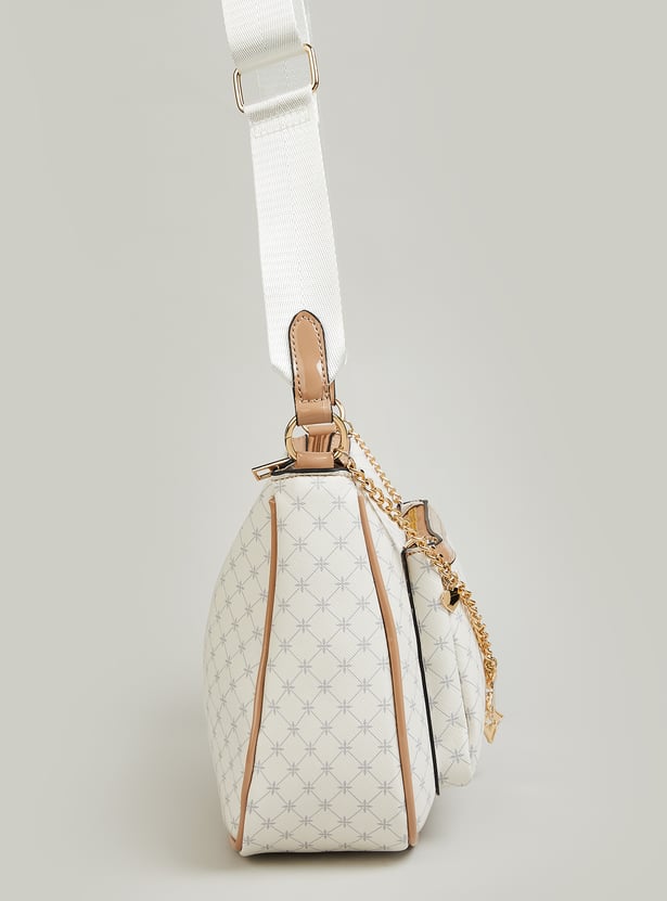Add a fun, stylish touch to your look with this printed sling bag. Featuring a zip closure, a front zip pocket for easy access, and a chain loop with charms for extra flair, it’s perfect for carrying your essentials in style.