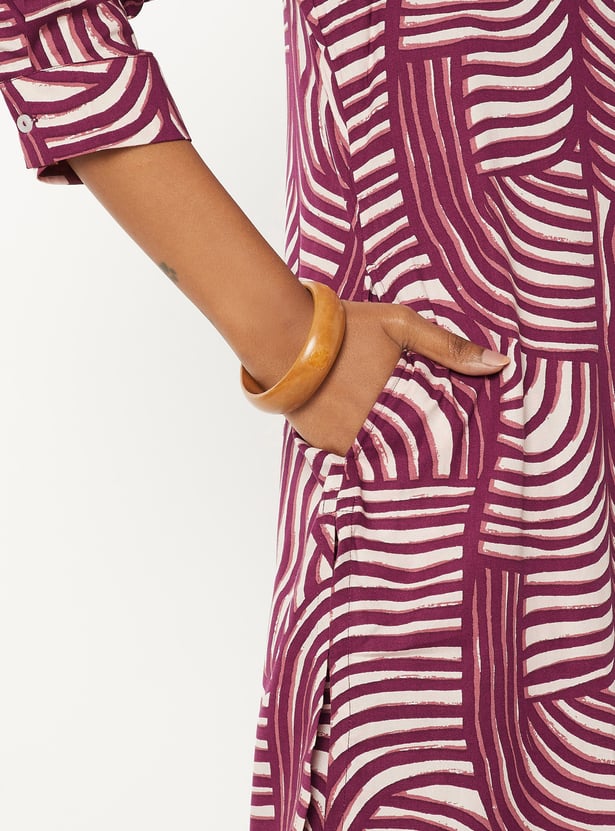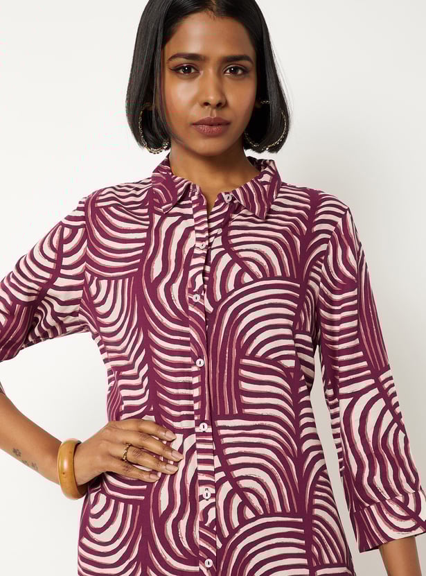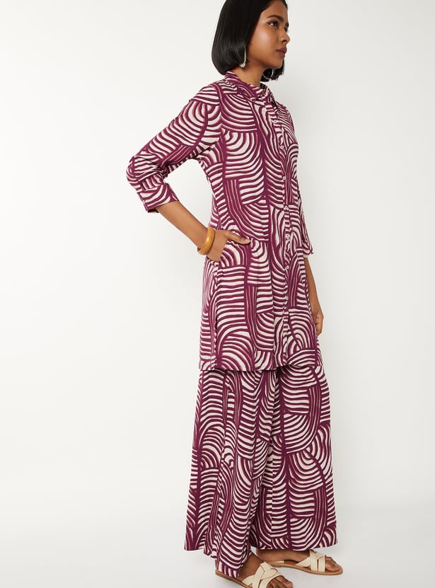 Embrace effortless elegance with this floral print kurta set. The kurta boasts a spread collar, button placket, 3/4th sleeves, and a tie-up at the waist, offering a flattering silhouette. Paired with an elasticated waist palazzos, this set ensures both comfort and style for any occasion.