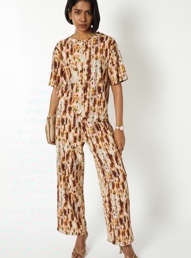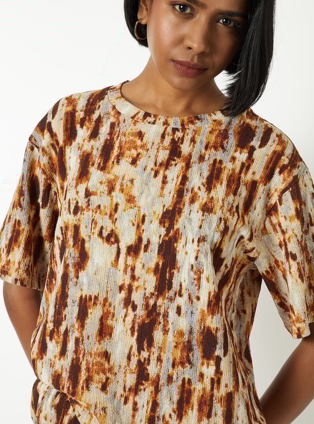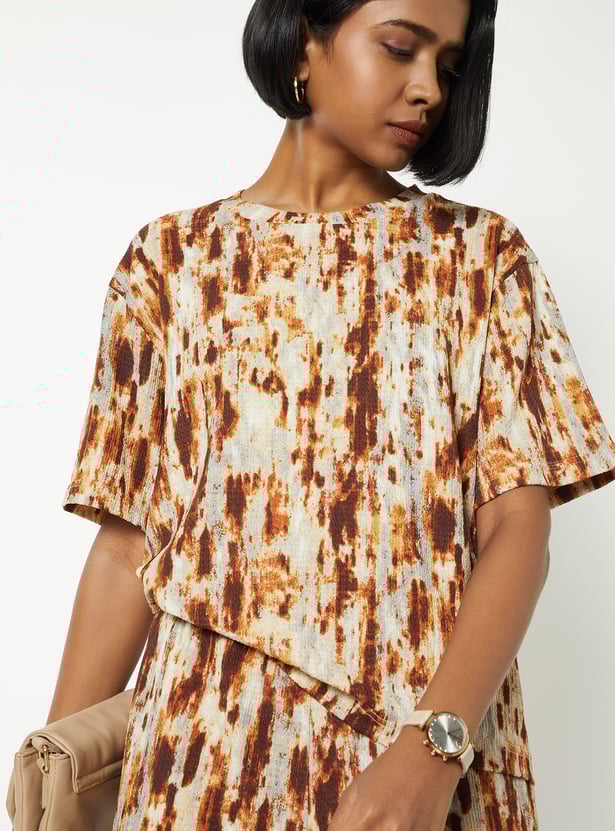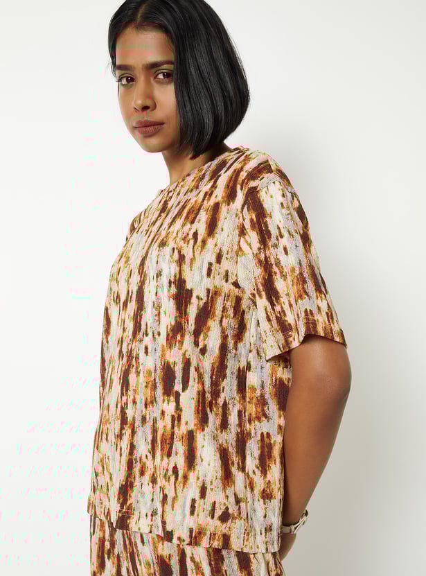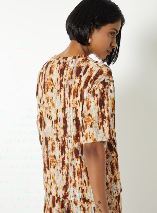 This printed top features a round neckline and half sleeves, offering a clean, versatile silhouette. The all-over print adds a lively touch, making it an easy choice for everyday style.