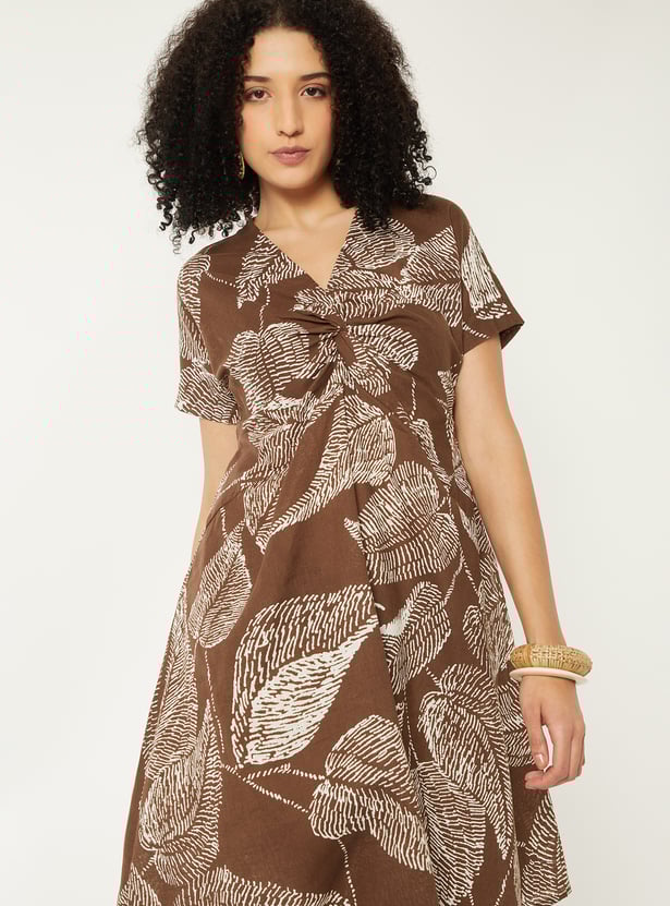 Stylish and modern, this printed twist detail dress features a flattering V-neckline and half sleeves for a balanced silhouette. The knee-length cut makes it versatile for both casual and semi-formal occasions