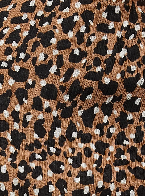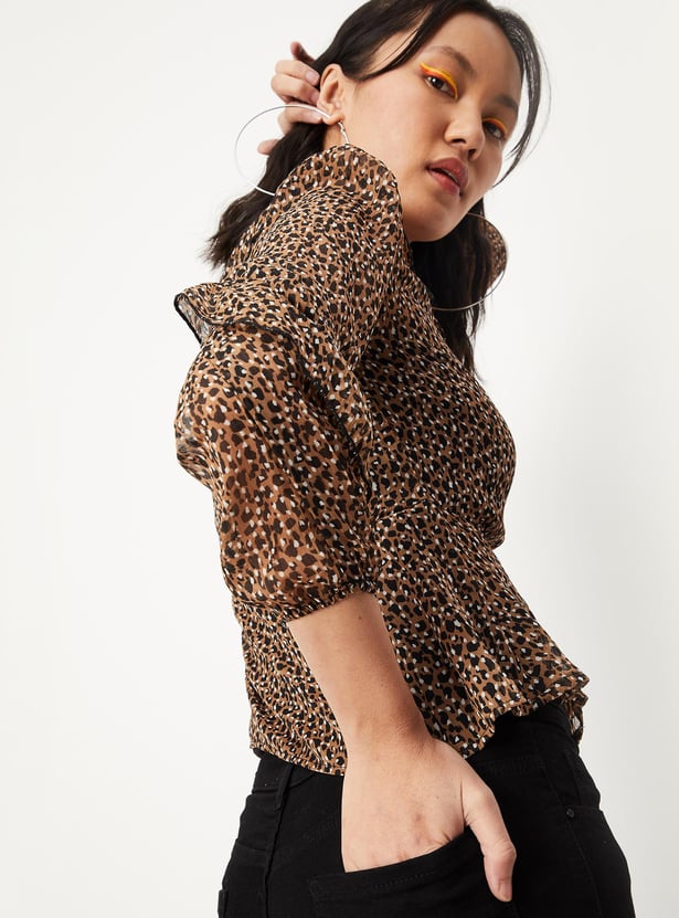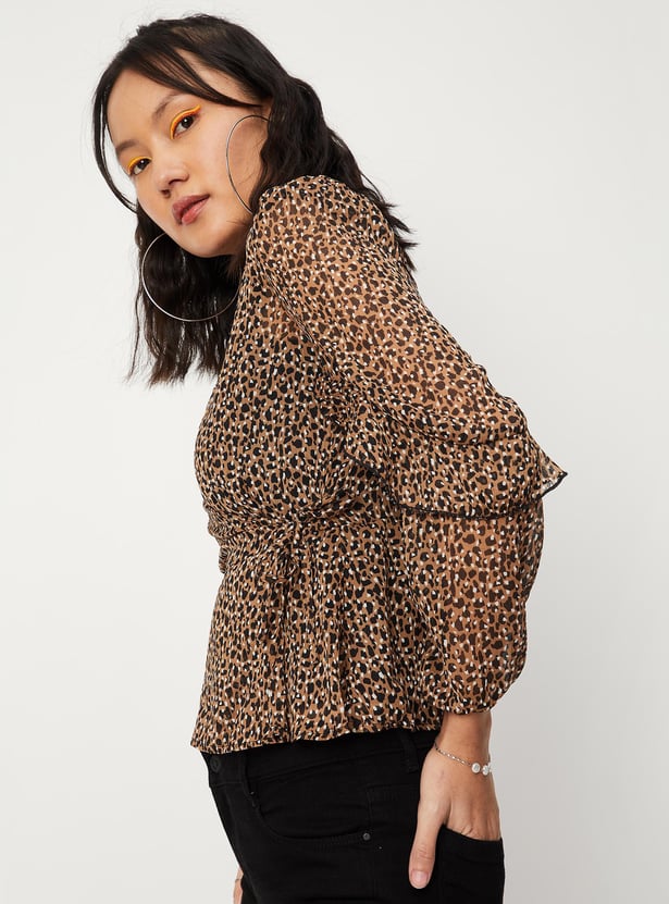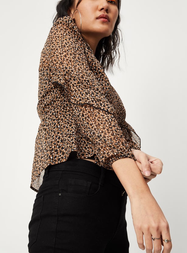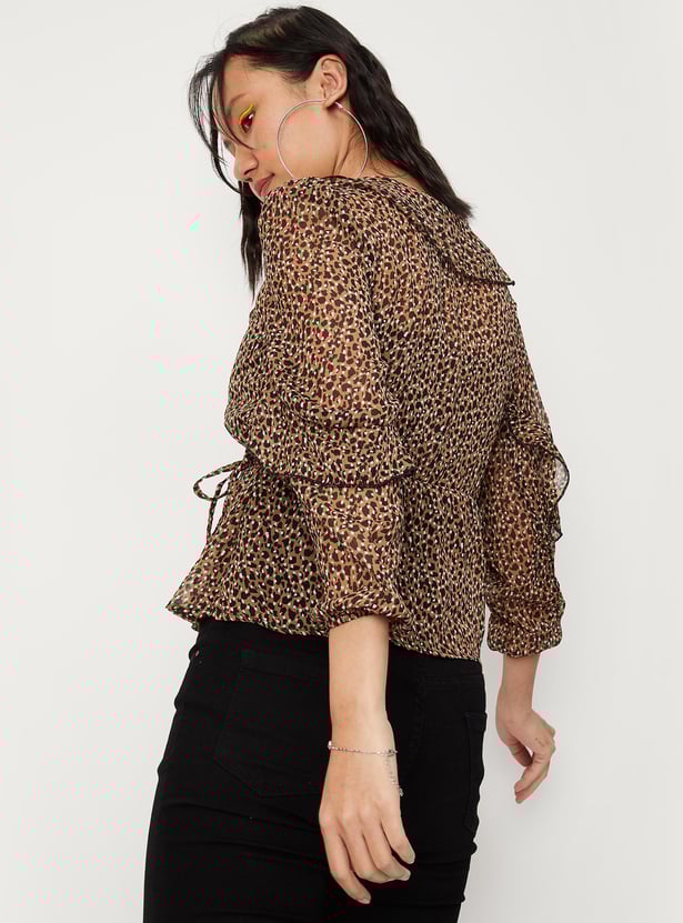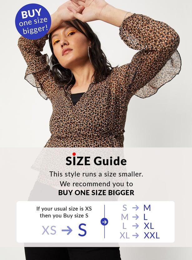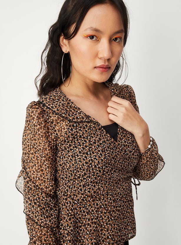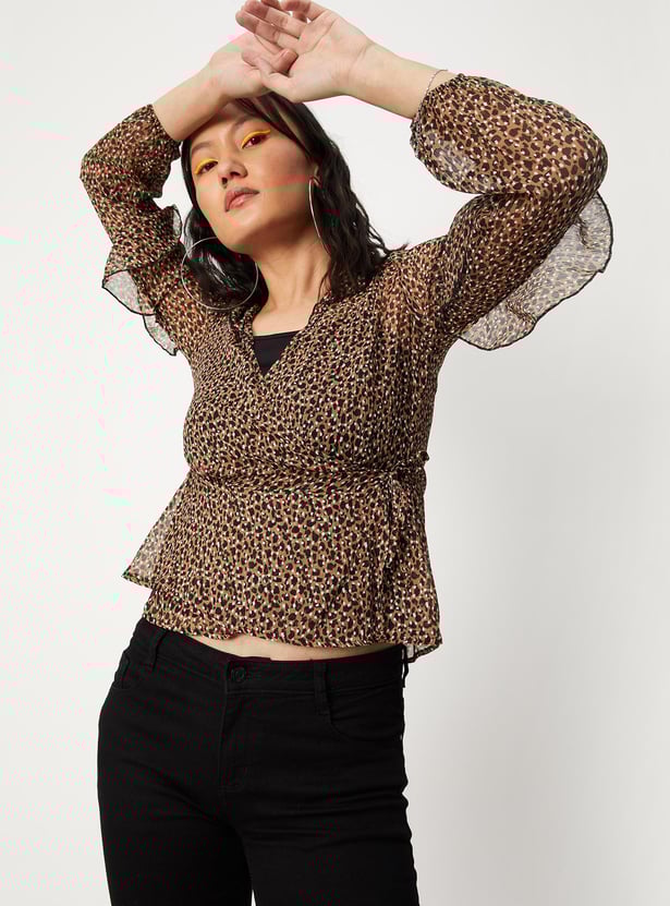 Switch up your style by adding this printed top to your casual collection. Crafted in a wrap profile, it features a surplice neck, ruffled detailing, long sleeves, a tie-up neck, and a peplum hem. This top comes with a solid camisole.