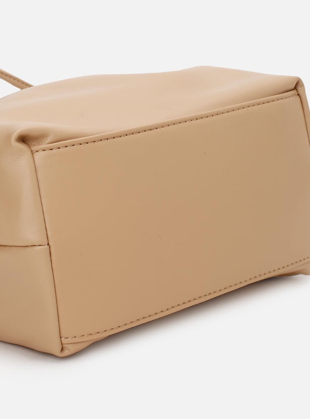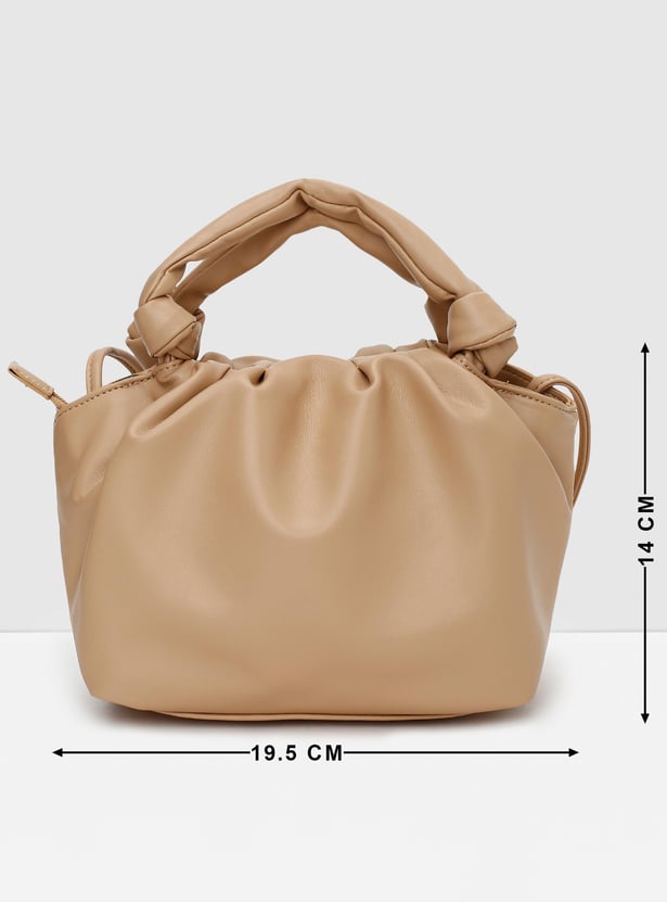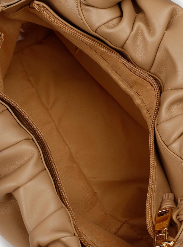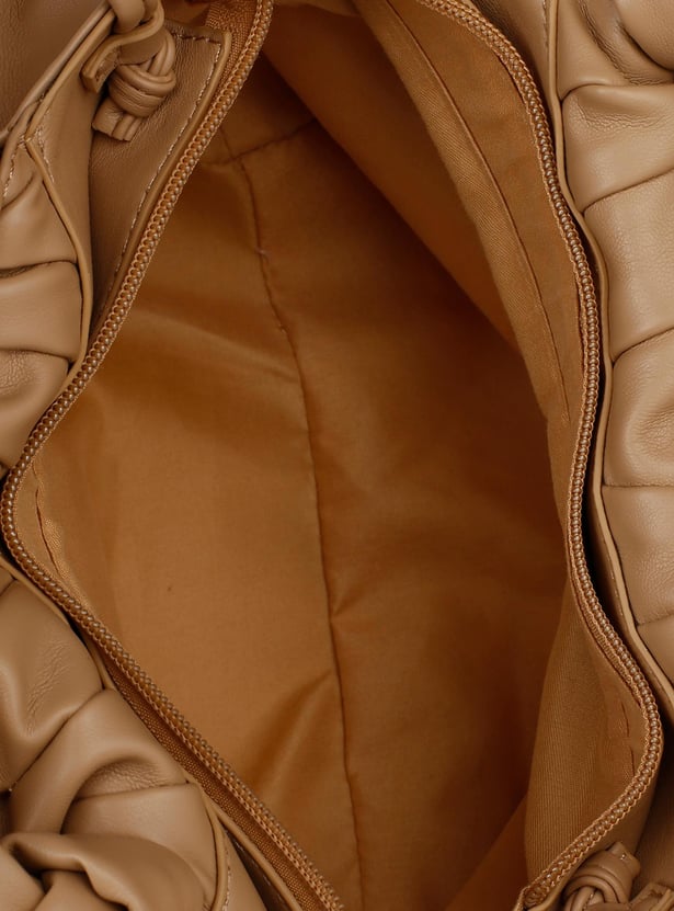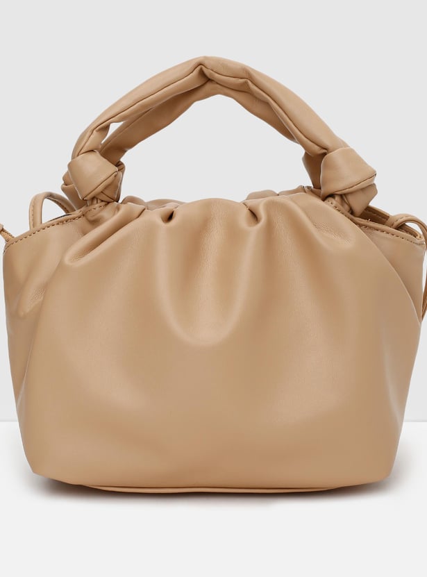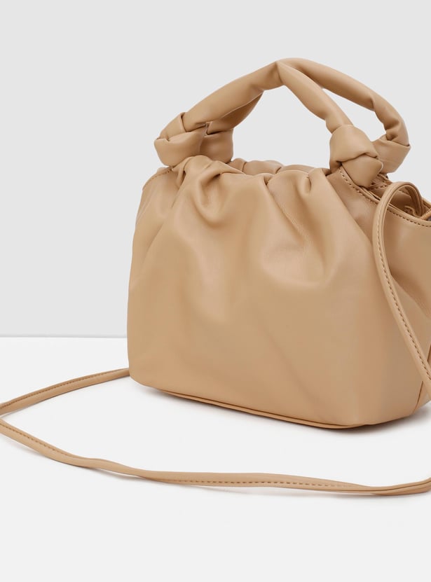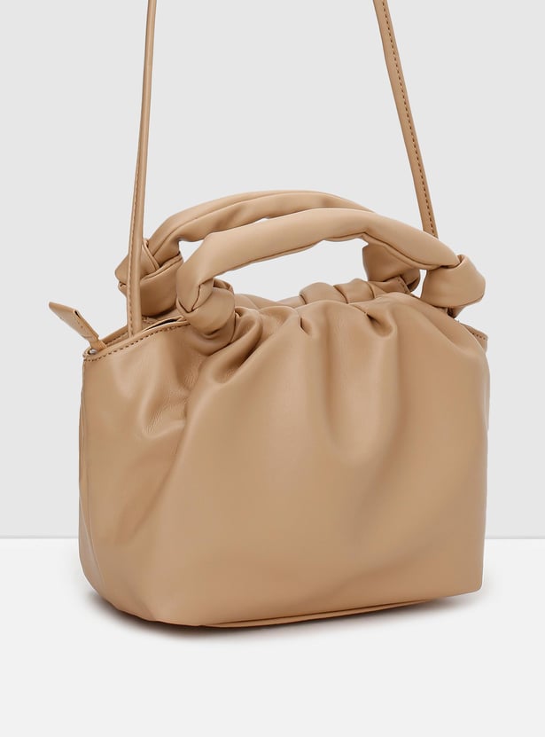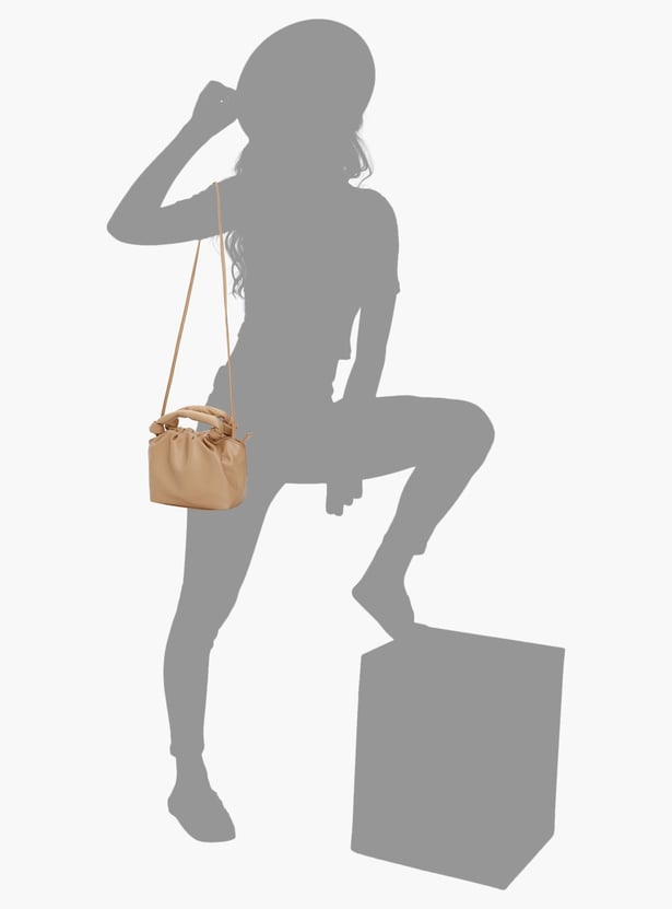 Accessorize your outfit with this sling bag. It features a ruched top, 2 handles, a crossbody strap, and a main zippered compartment.
