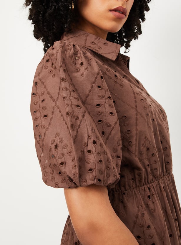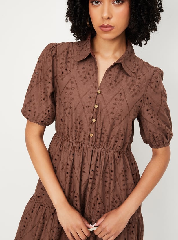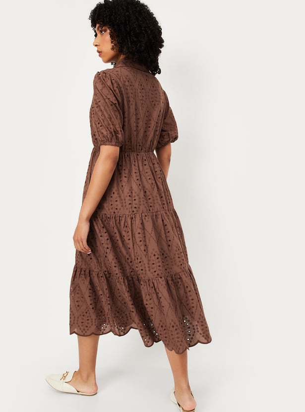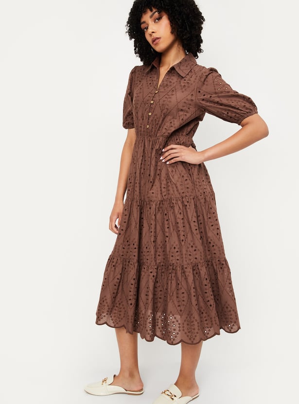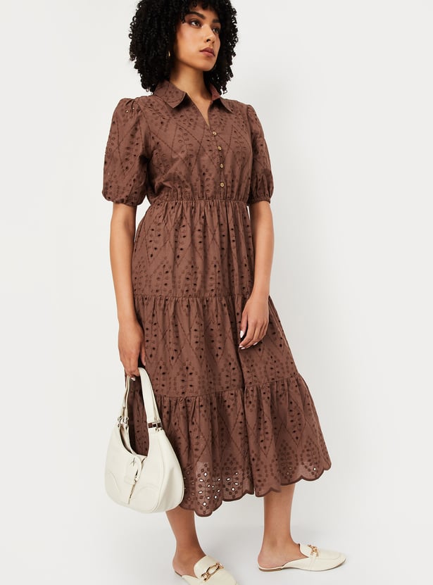 This Schiffili tiered midi dress exudes feminine charm with its delicate details. Featuring a collared neckline, puff half sleeves, and a flared hem, it offers a graceful silhouette perfect for any occasion. Model Size :