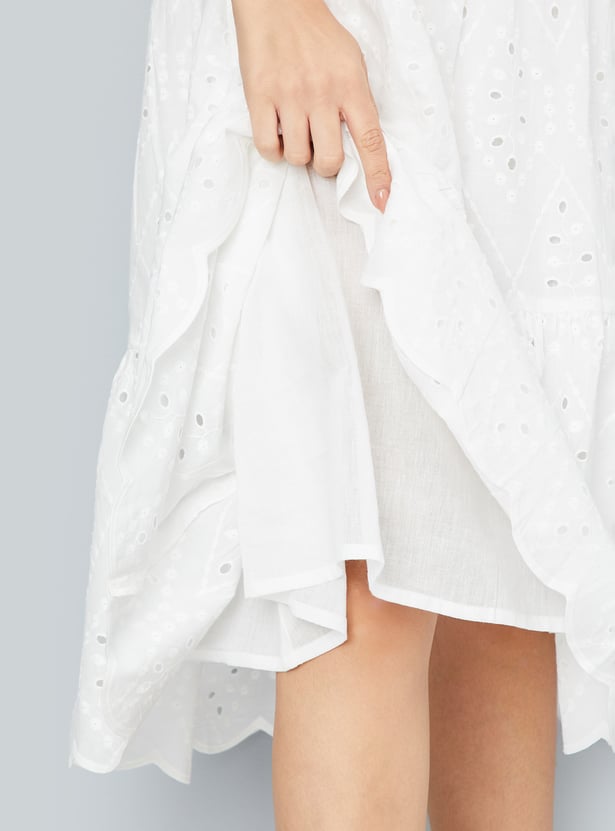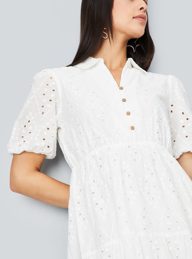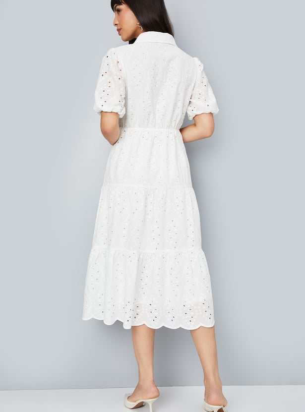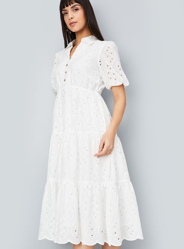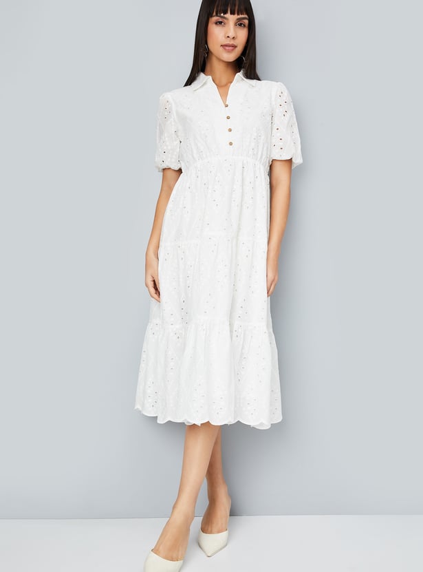 This Schiffili tiered midi dress exudes feminine charm with its delicate details. Featuring a collared neckline, puff half sleeves, and a flared hem, it offers a graceful silhouette perfect for any occasion. Model Size :