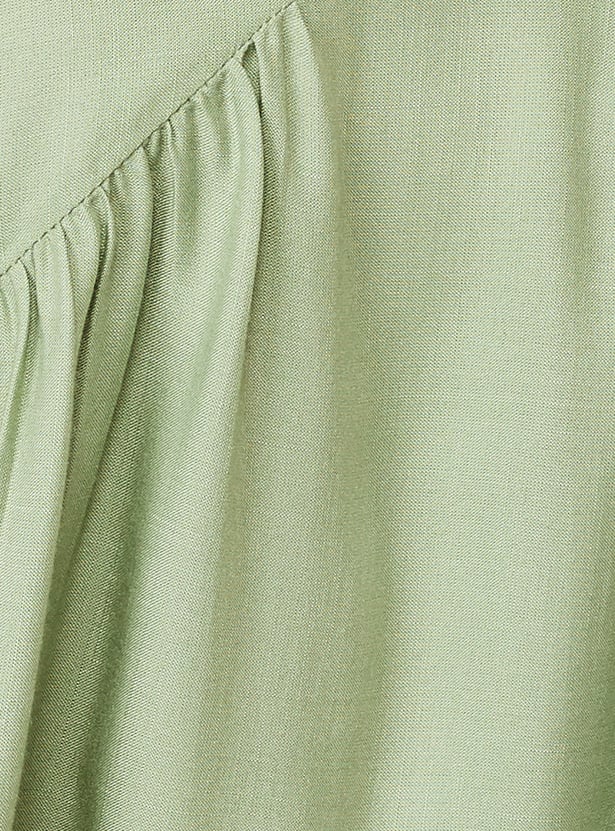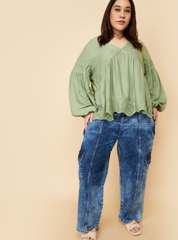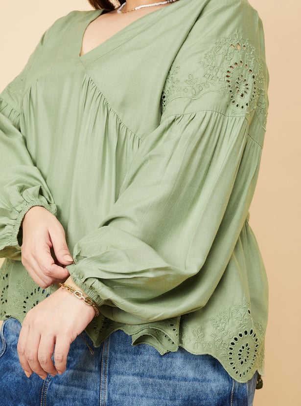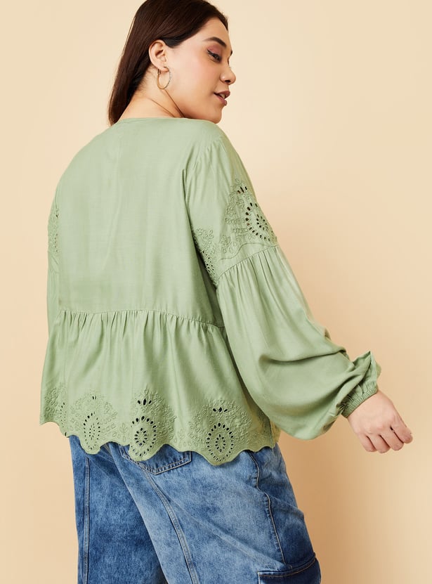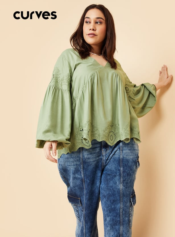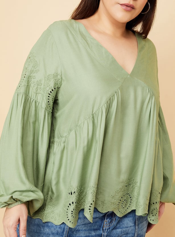 Add charm to your wardrobe with this Schiffli woven peplum top. Featuring a flattering V-neckline and full sleeves, this top boasts intricate Schiffli detailing for a touch of elegance. The peplum silhouette enhances your style, making it perfect for a casual outing. Model Size :