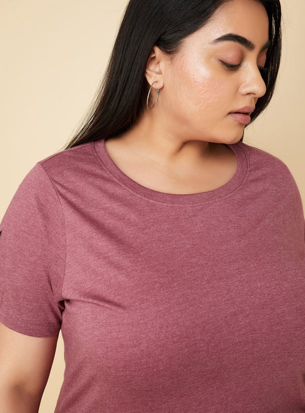 Give your casual look an updated style with this top rendered in a solid tone. It is highlighted with a slit sleeve with button accents and a step hem. A round neck and step hem complete the look.