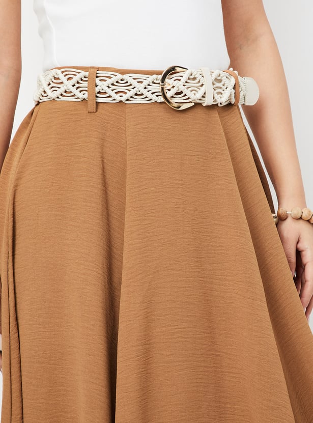 Add timeless elegance to your wardrobe with this solid belted skirt, featuring a long length and a flared hem for a flattering A-line silhouette. The belt cinches the waist, creating a chic, defined shape.