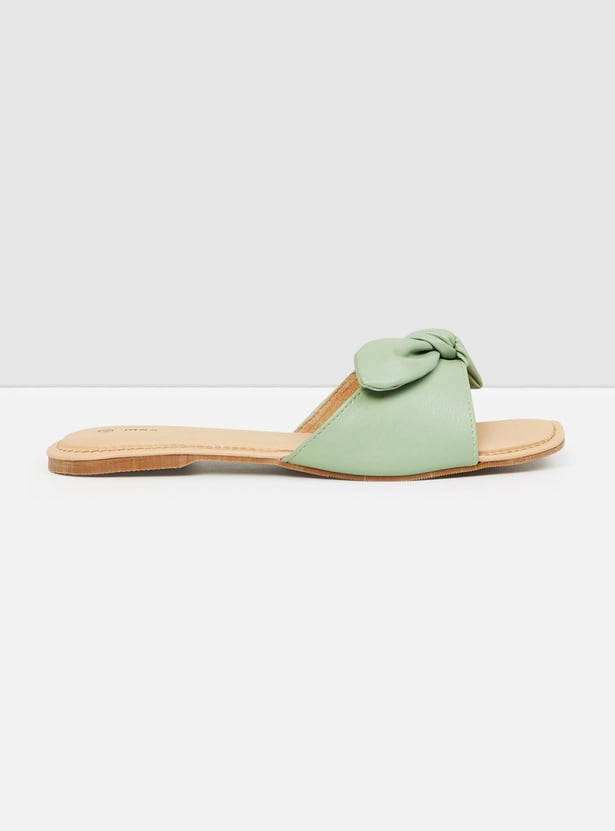 Detailed with a solid surface, bow detailing, and slip-on fastening, this pair of sliders is a chic upgrade for your footwear collection. The pair has a flat and comfortable sole detail for added convenience.