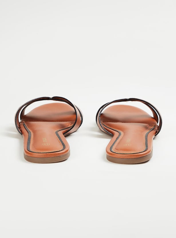 Time to style up your comfort with this pair of flats sandals featuring solid straps, a square toe, and a comfortable footbed.