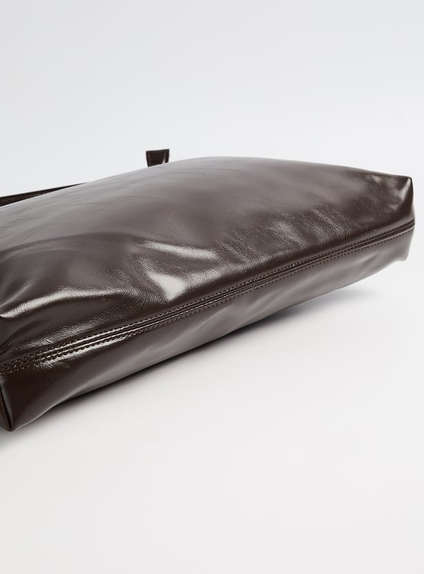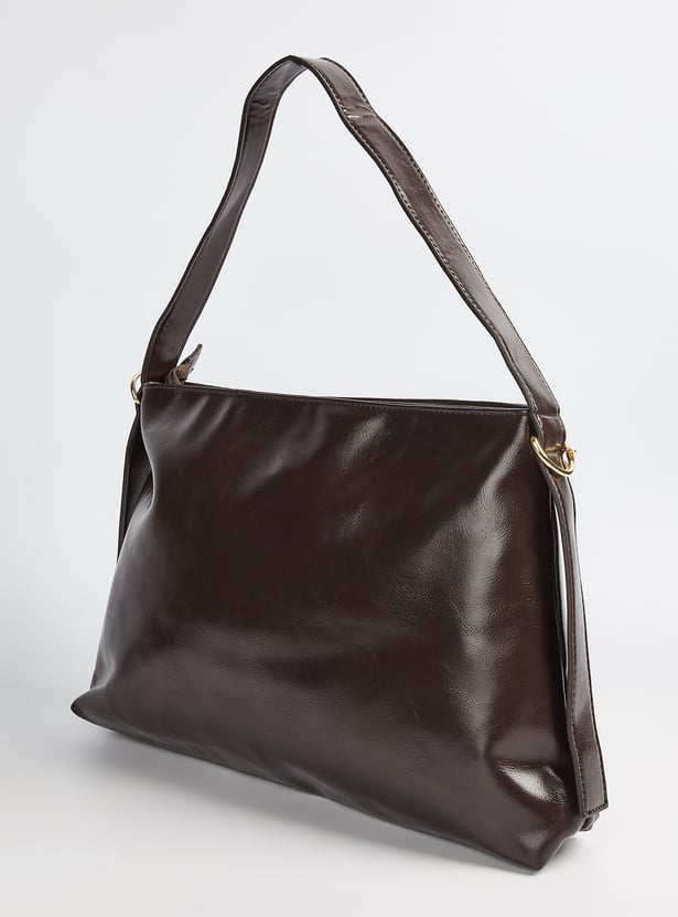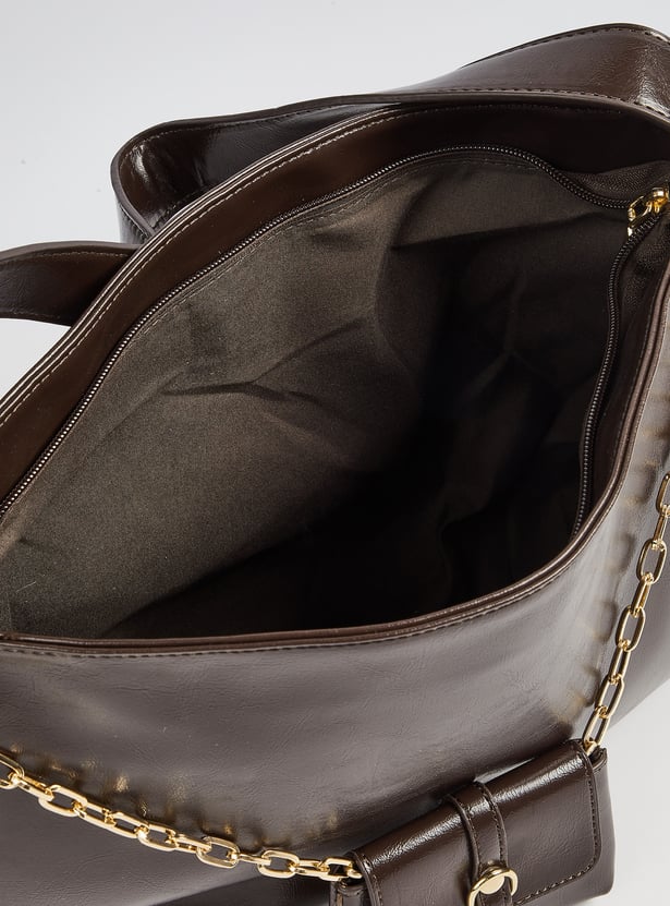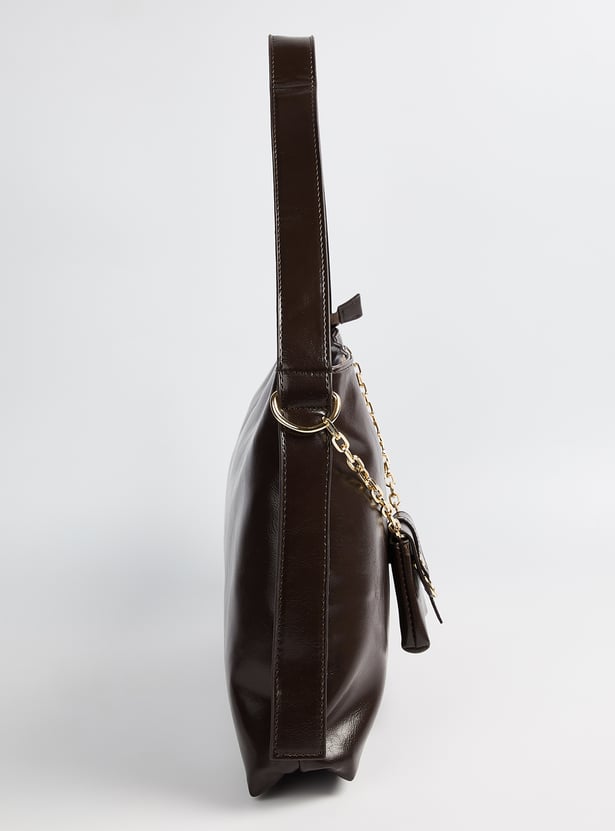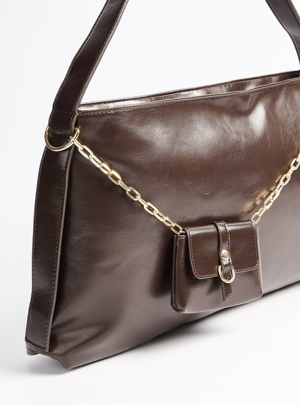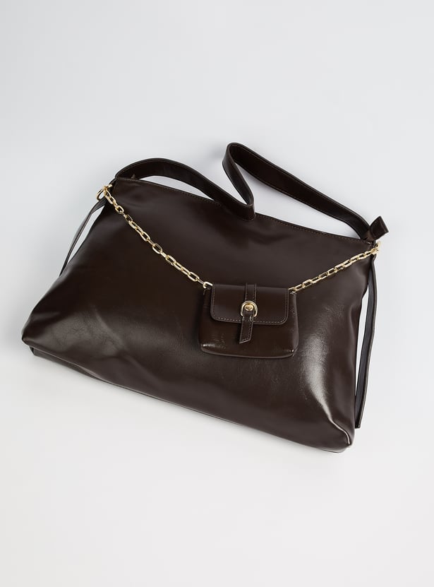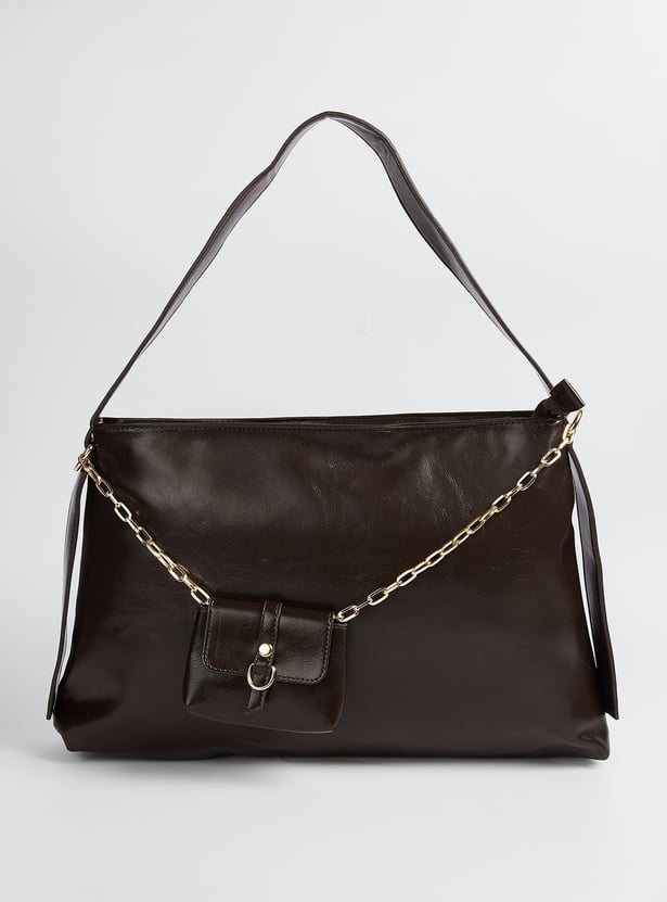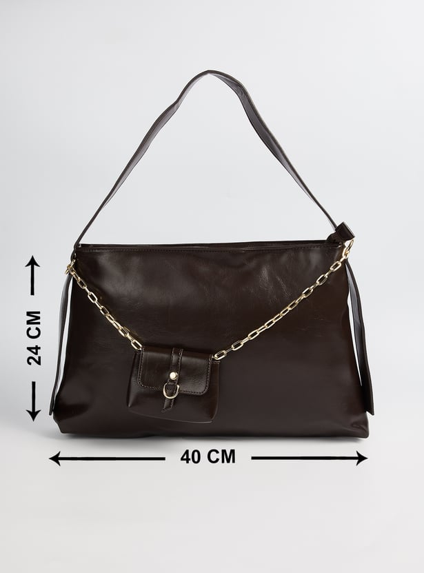 Add a modern staple to your accessory collection with this solid bag with an attached pouch featuring a zip closure, a shoulder strap, and a pouch with a chain detail. It blends practicality with a stylish edge.