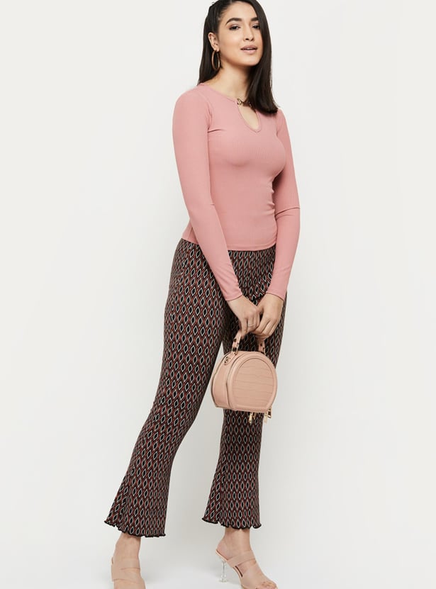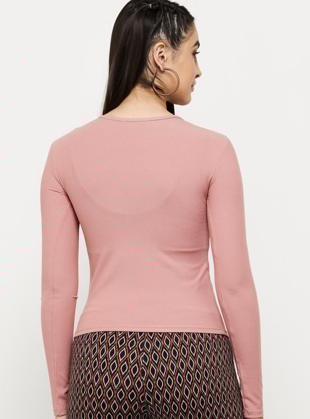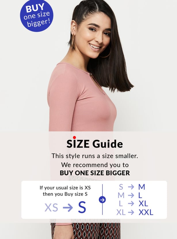 For your fashionable casual look, a chic and trendy top with pleasant solid design, full sleeves, embellished keyhole neckline, and fuctionally slim fit.